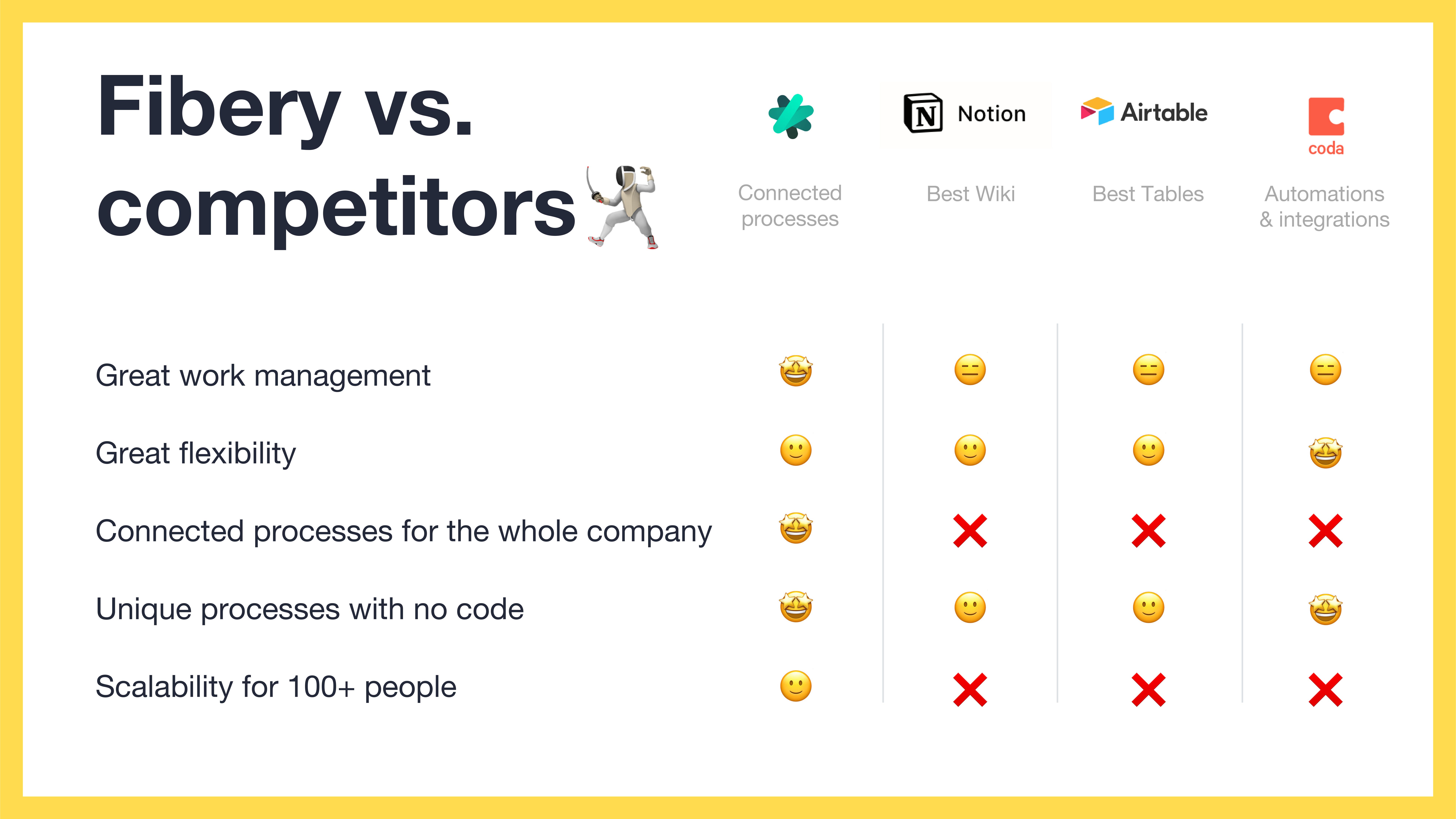 On slide 6, there’s a slightly deeper dive into the other no-code tools Fibery considers to be competitors. Again, the company is choosing to praise its competitors for their strengths (“Best Tables” for Airtable and “Best Wiki” for Notion).