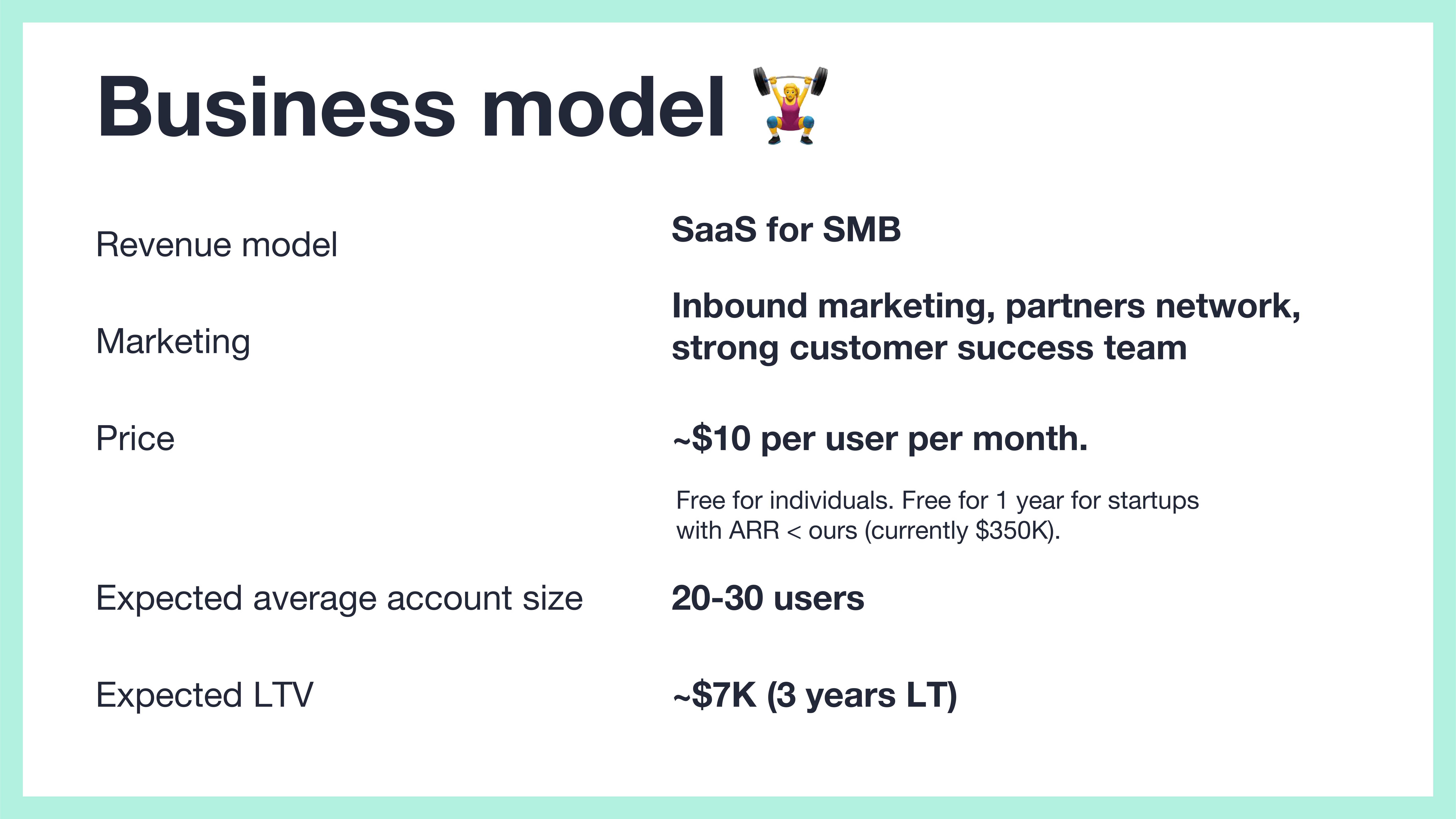 I love a good, clear business model, and Fibery’s is a pretty decent example here; it shows the high-level pricing model (multiaccount SaaS), the target market, and how it is pricing itself. It shows an expected LTV that’s pretty conservative (the $7,000 LTV using these numbers assumes an average account size of 20 or so).
