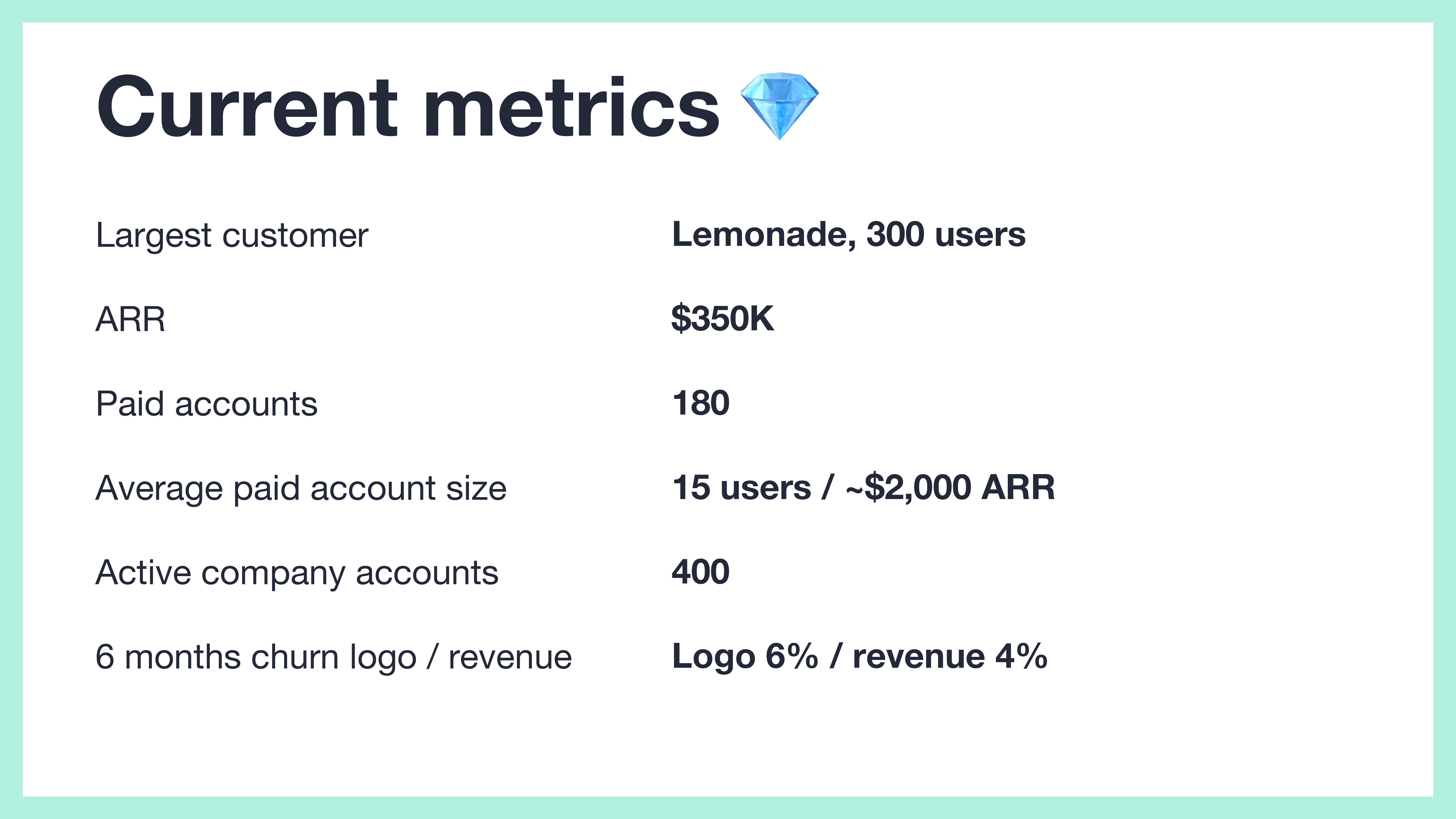 A good traction slide forgives all sins, and this is a great snapshot of where the business is right now. The fact that the logo churn (i.e., churn of number of customers) is higher than the revenue churn indicates that the company is able to retain its higher-value customers. That’s good. The rest of the stats look good, too, for a company at this stage. Clear, simple, concise.