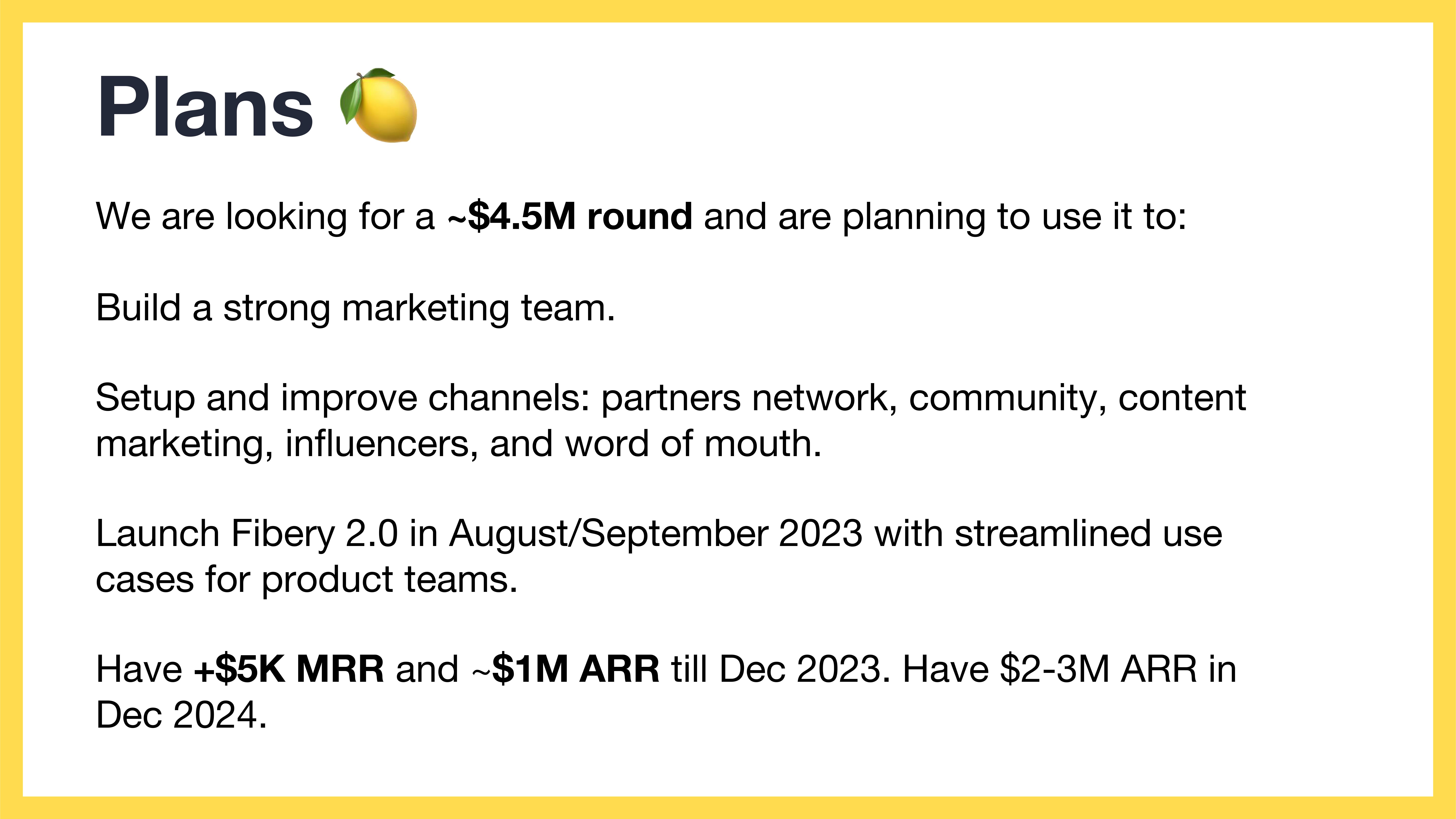 The slide is labeled “plans,” but this is what I usually refer to as the “ask” slide. Lots of founders get this wrong, so it’s a delight to see it done so well. Fibery doesn’t explain what a “strong marketing” team is, and “setup and improve channels” doesn’t mean much. Having clear MRR and ARR goals for EOY 2023 and 2024 is great, and having a clear launch target for a new version of the platform is even better.