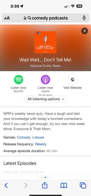 Apple isn’t the only beneficiary here, it seems, as the same functionality is available for Spotify, as well. To see Google Podcasts, you have to click another button — “All Listening Options,” which reveals further choices. (No self-preferencing here, apparently!) Spotify said the feature has been live for its app for over a year, but Apple confirmed the functionality we’ve described is, in fact, new for Apple Podcasts.