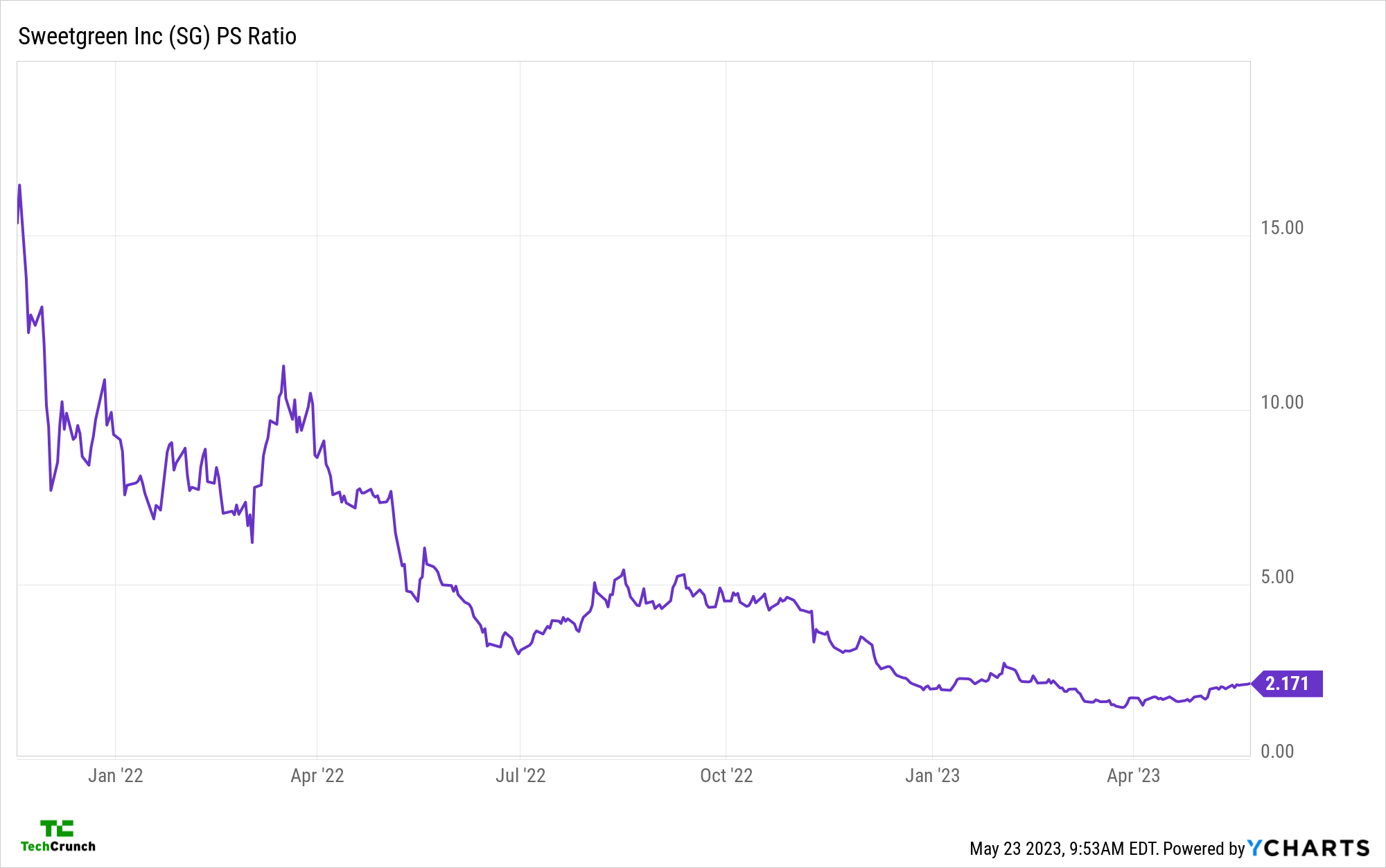 We should mention that the chart above uses trailing revenue results to generate the final figure. However, if we take Sweetgreen’s Q1 2023 revenue and annualize it, we get a very similar figure, so a multiple around 2x revenue seems like the right figure to derive from its valuation.