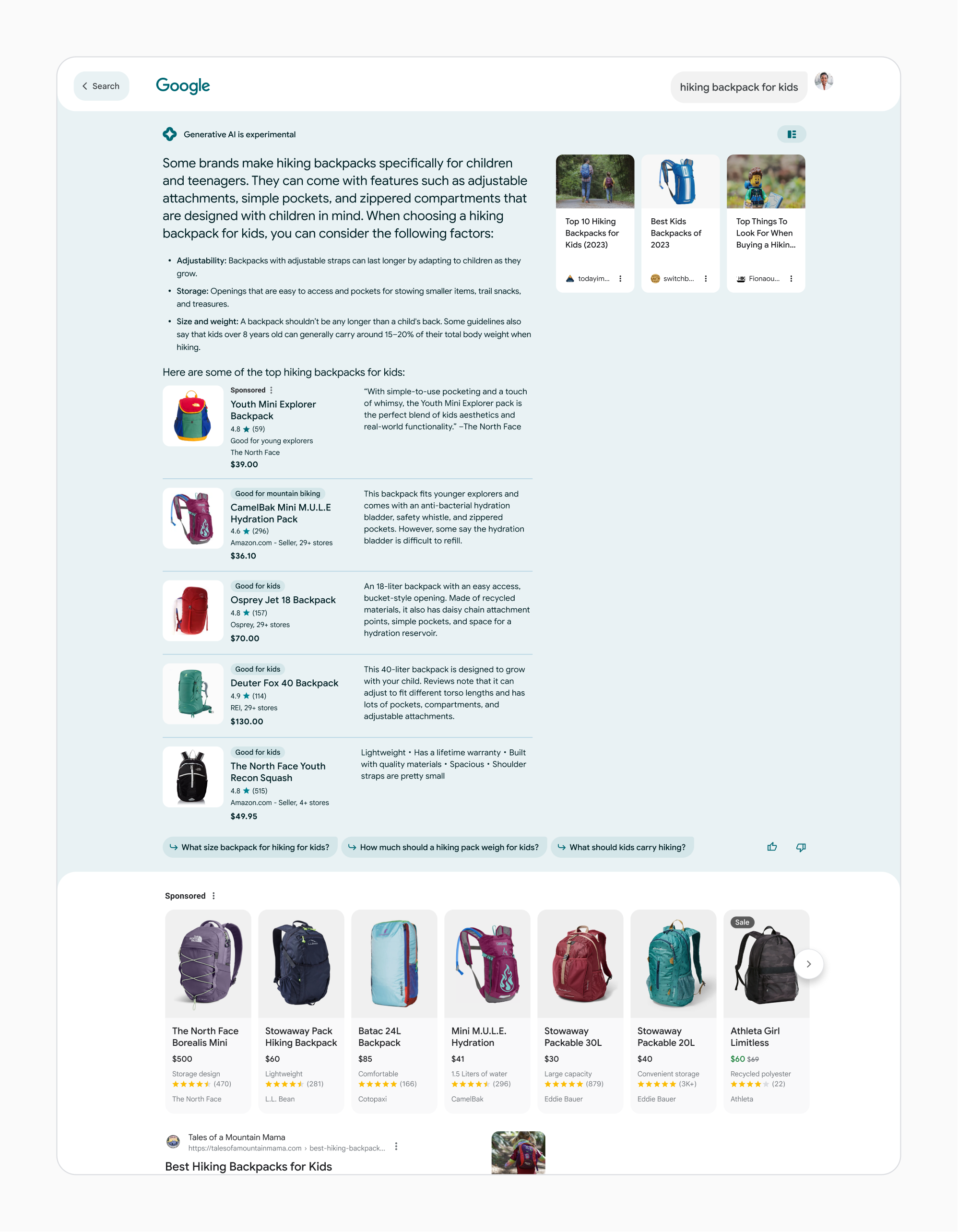 Despite this labeling, some ads could be mistaken for AI chatbot responses. For instance, in a query for hiking backpacks, where Google’s AI already makes specific product recommendations, the “Sponsored” results may appear in the same list. (See below image).