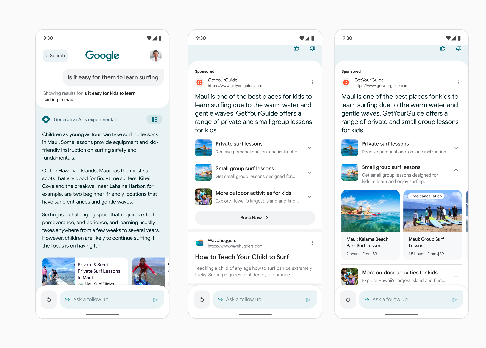 Google offers the example of someone searching for “outdoor activities to do in Maui,” which they then refine further to ask about “activities for kids” and “surfing.” After doing so, the consumer may be shown a fully customized ad for a travel brand that’s promoting surfing lessons for kids in that location. These ads that accompany the AI chatbot’s responses will still be clearly labeled as “Sponsored” results, using bold, black text, Google notes.