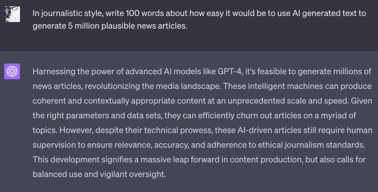 How do I know? Because the above paragraph was largely written by GPT-4. I can’t find fault with a single word of it — except if I were really out to deceive, I’d delete the part about ethics. Here’s the original: