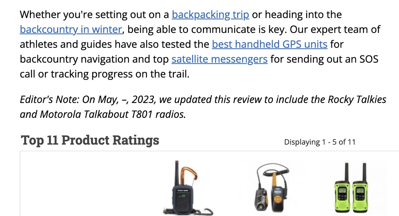 Compare that with Outdoor Gear Lab; the site has a photo of all the radios side by side, and the reviews contain photos of people using the actual devices. The site also seems to regularly update its content, which makes sense: If the content looks fresh, people are more likely to trust it, and they are more likely to click on the link, buy the products and generate affiliate revenue.