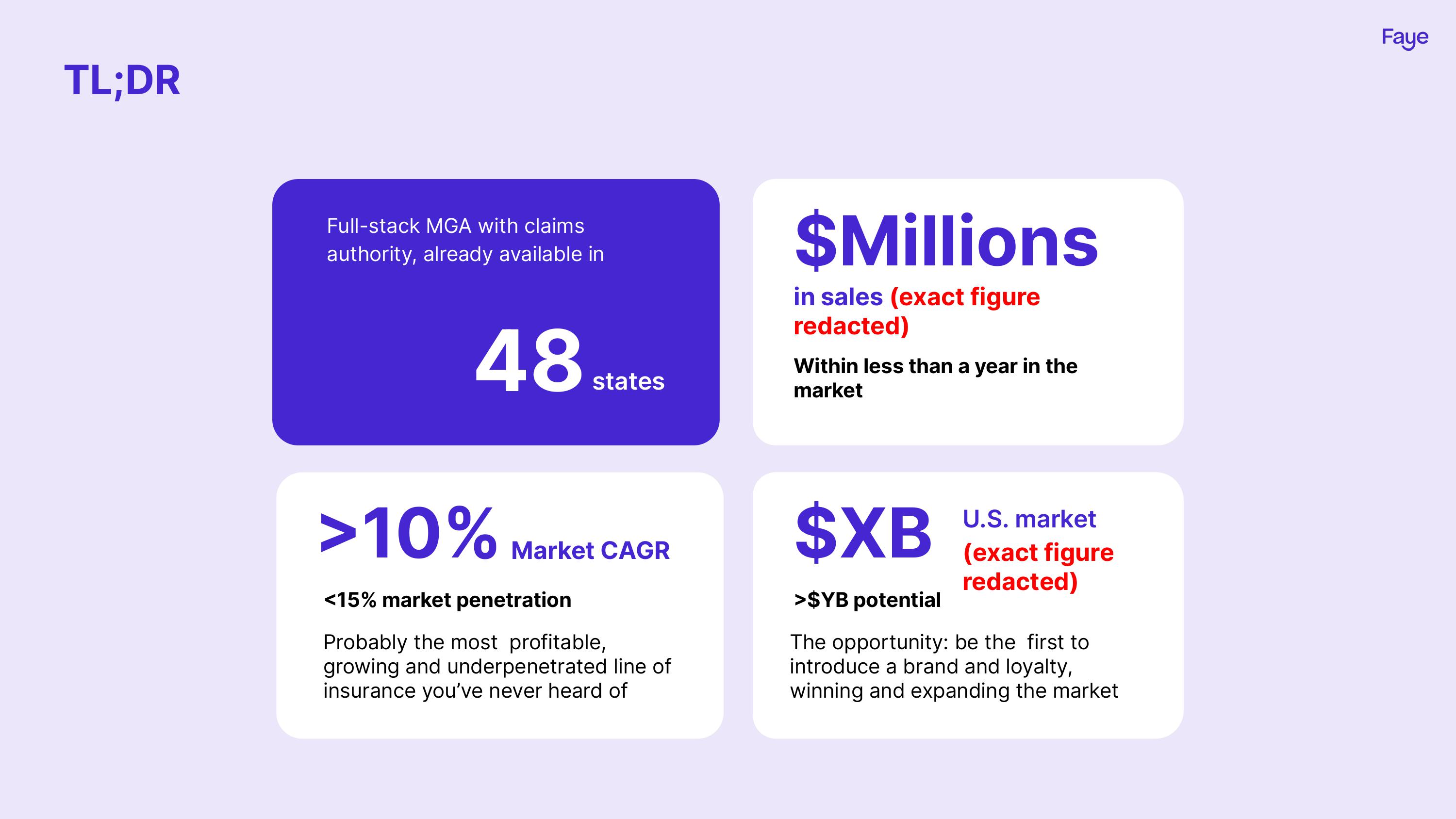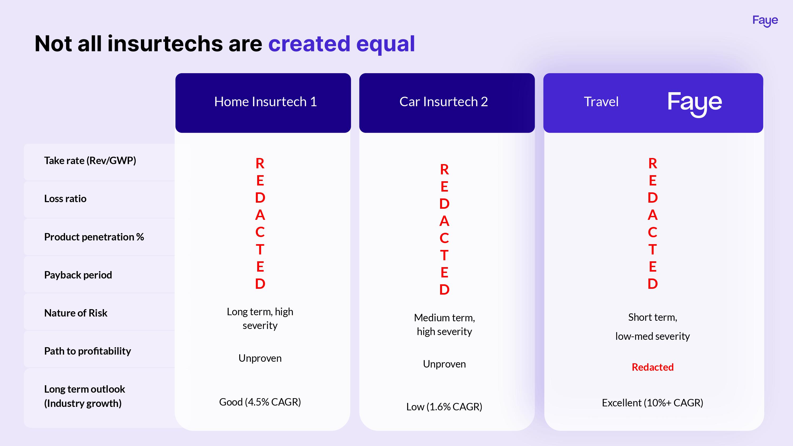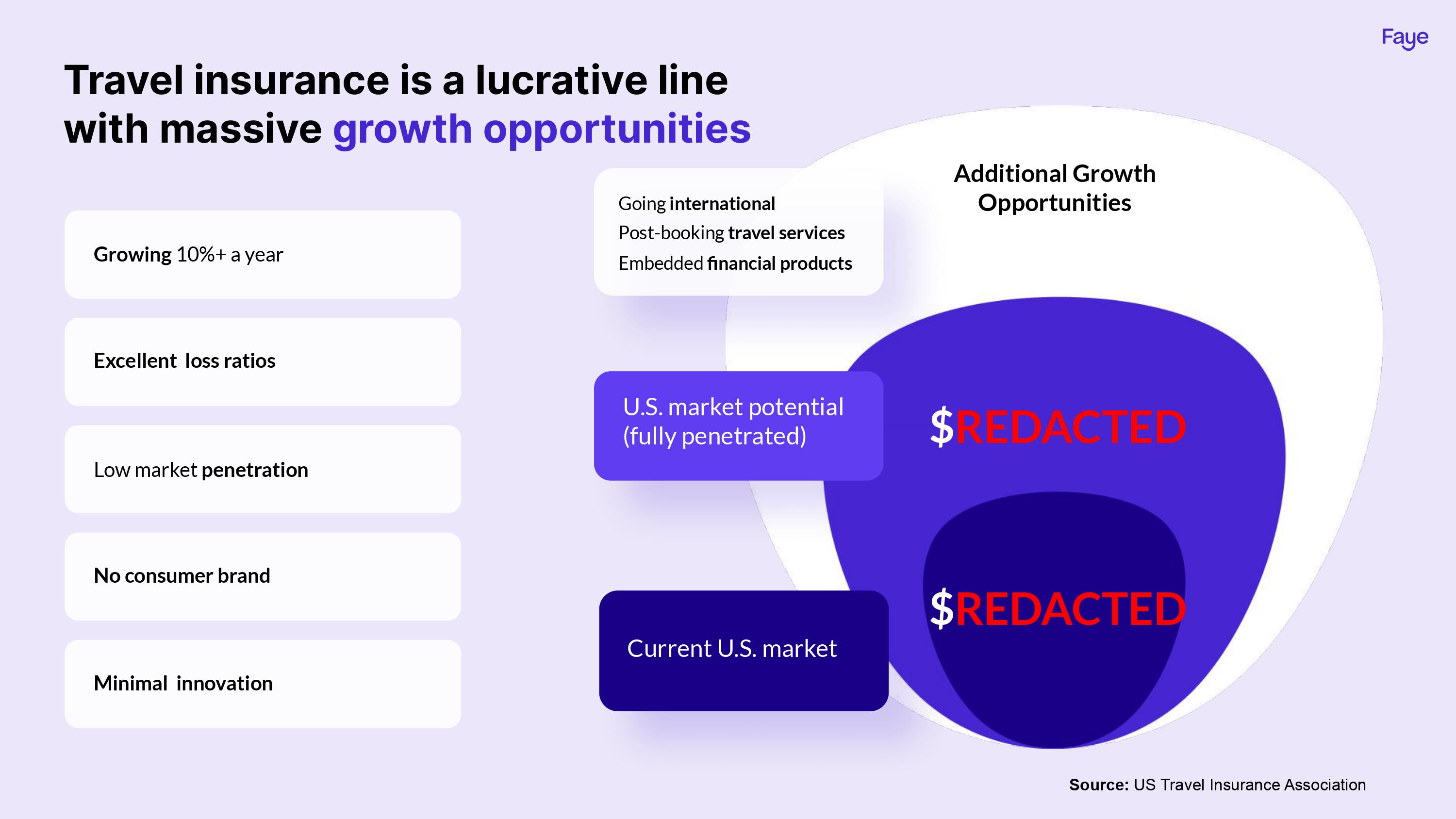 Faye is targeting travel insurance, using some adjacent markets (car and home insurance) as comparisons to show that travel insurance is a better opportunity. Again, the numbers here are redacted, but as far as storytelling goes, this is a really good approach: