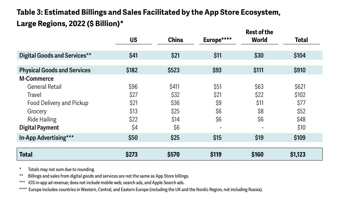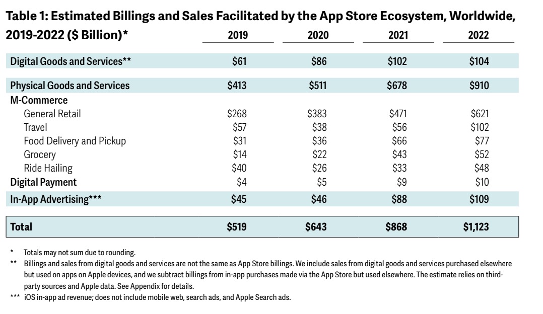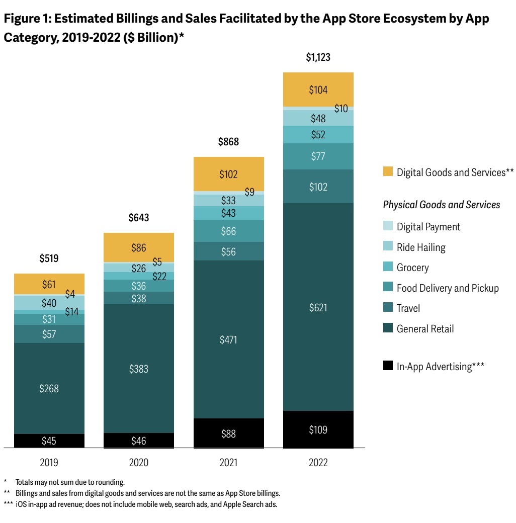 This $1.1 trillion breaks down as $910 billion in total billings and sales from the sale of physical goods and services, $109 billion from in-app advertising and $104 billion for digital goods and services.