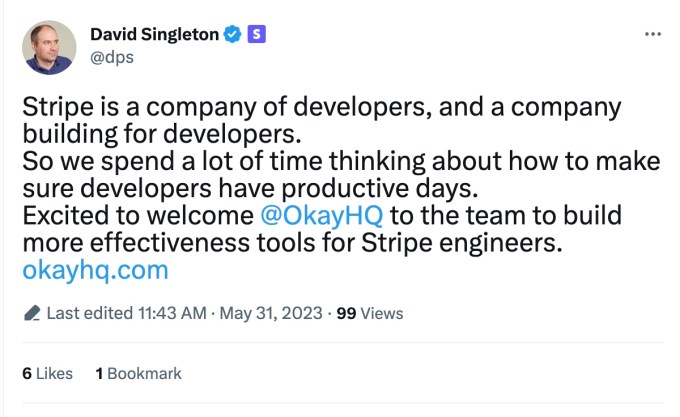 Stripe declined to comment on its acquisition of Okay, outside of confirming that it had taken place and this tweet from CTO David Singleton.