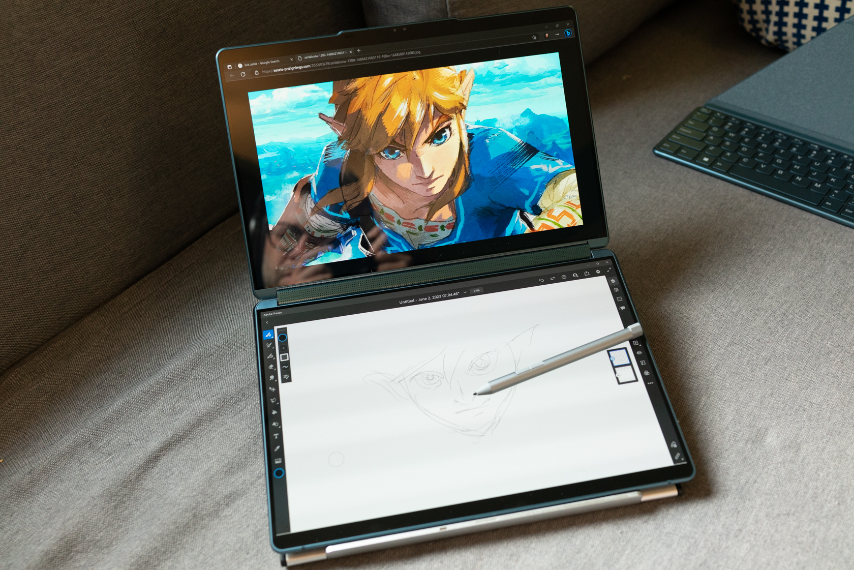 Aside from the performance of its components, one key to the Lenovo Yoga Book 9i’s success is just how good it is at taking advantage of its unique physical design. As you’d expect, there are compromises when it comes to using a notebook with two screens instead of just one with a hardware keyboard and trackpad permanently installed in the other.