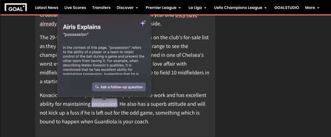The company says that the unique thing about Airis, its AI assistant, is that understands a page’s context and gives you answers based on that. Here’s a good example: if you are reading about Manchester United, ask Airis to explain “United” or ask questions about it, the bot understands that you are asking about the football team and not just the word.