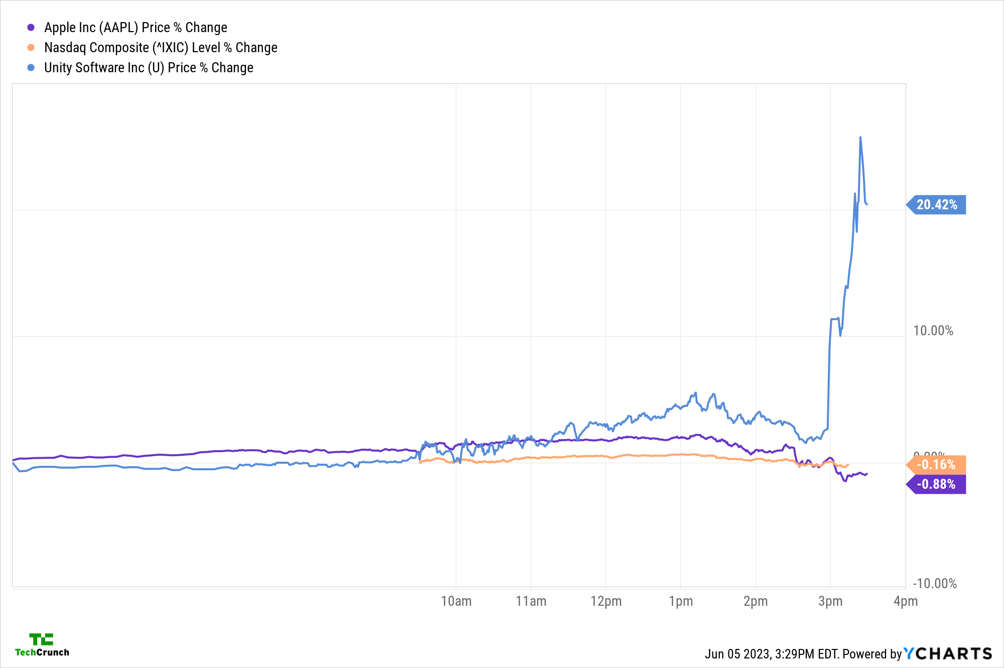 But not everyone was so bummed. After Unity got a shoutout for integrating its software with the new Apple device, its shares went straight up. Here’s the same chart as above but tweaked to also include Unity’s stock: