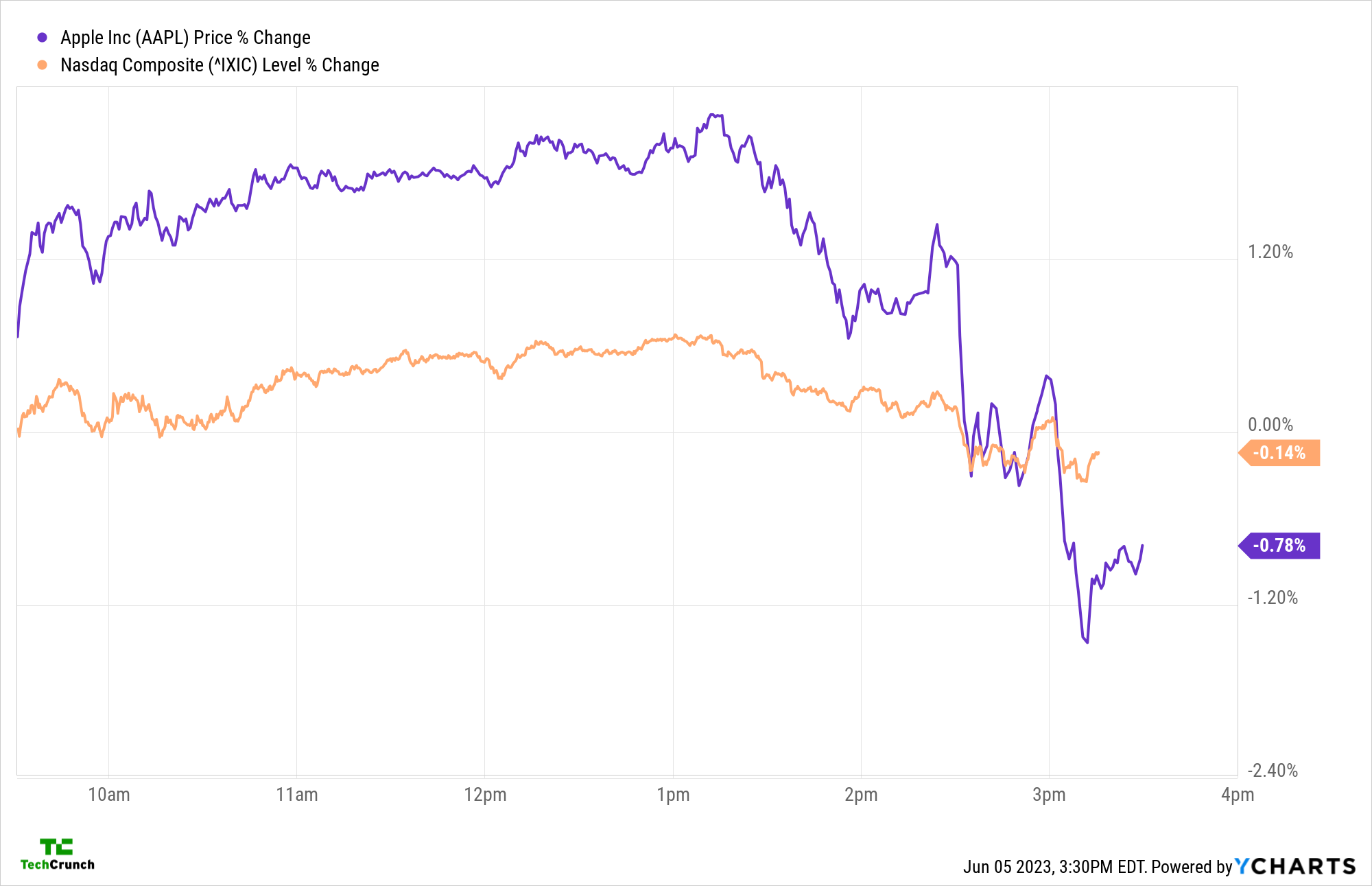 By my notes, the Apple headset bit kicked off around 2:20 p.m. to 2:25 p.m. ET, which you can spy as a nice little wiggle in the chart. However, if Apple shareholders had hoped that the actual announcement of the Vision Pro device would bolster the value of their holdings, they were disappointed. Some headlines are already linking the headset’s launch to Apple’s falling share price. Alas.