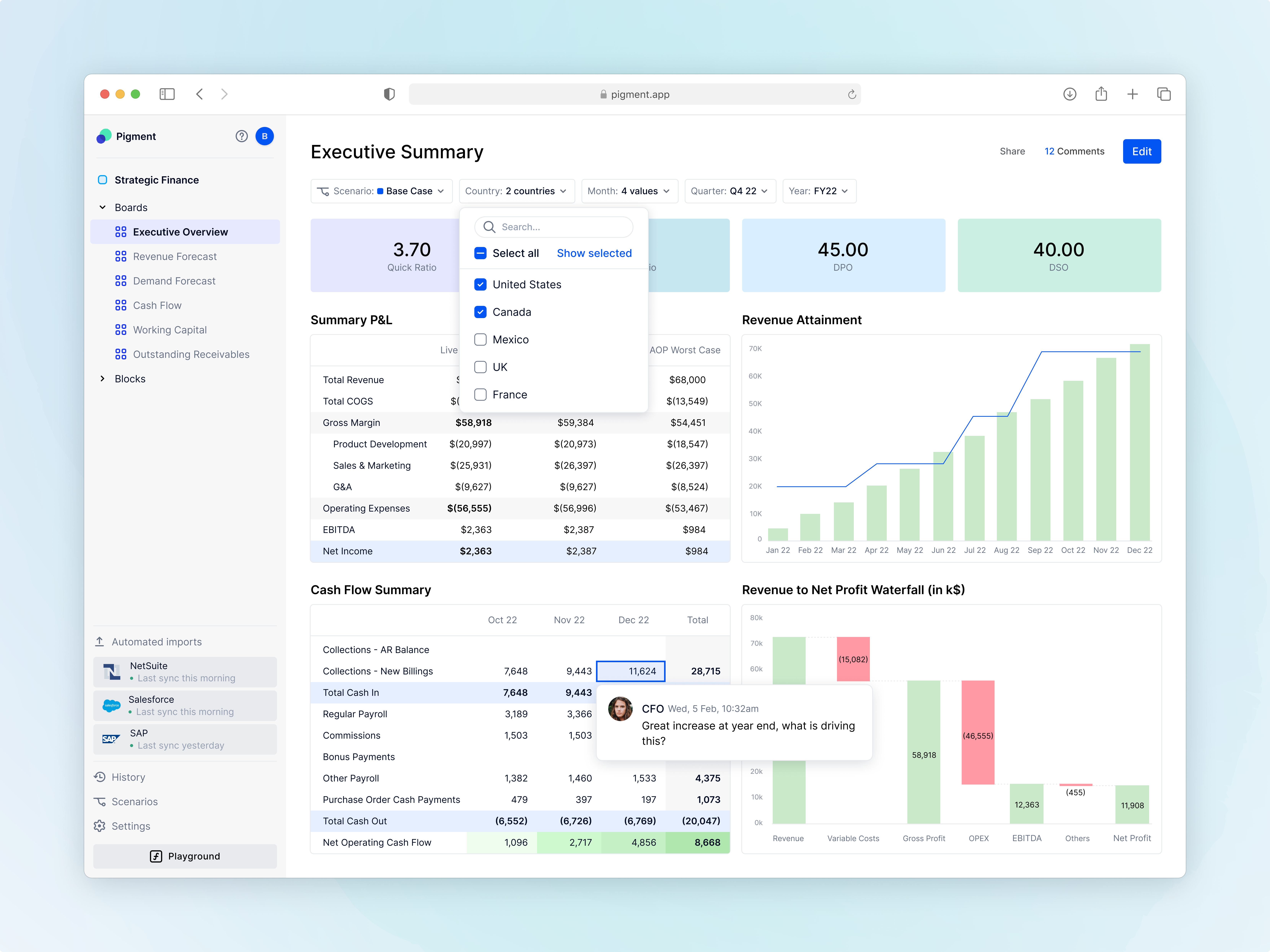 As a modern software-as-a-service product, Pigment is also collaborative. For instance, the finance team can ask questions to the HR team to understand why a particular budget is so high. Users can then create “what-if” scenarios and estimate how some changes would affect the business without messing with the main dashboards.