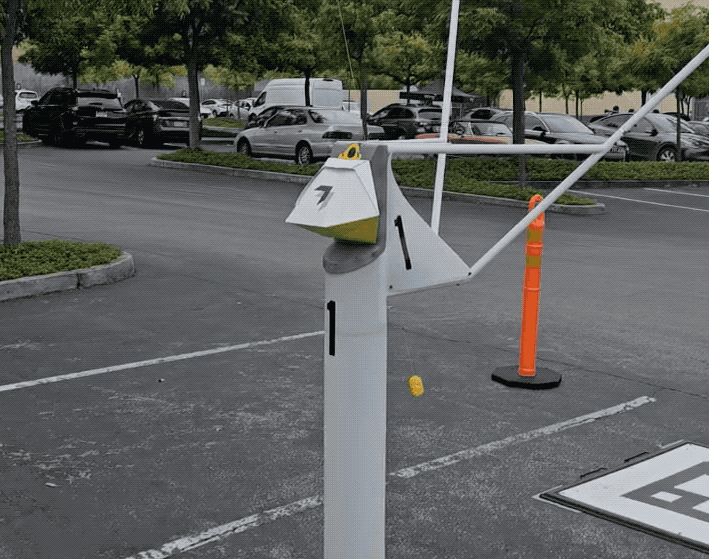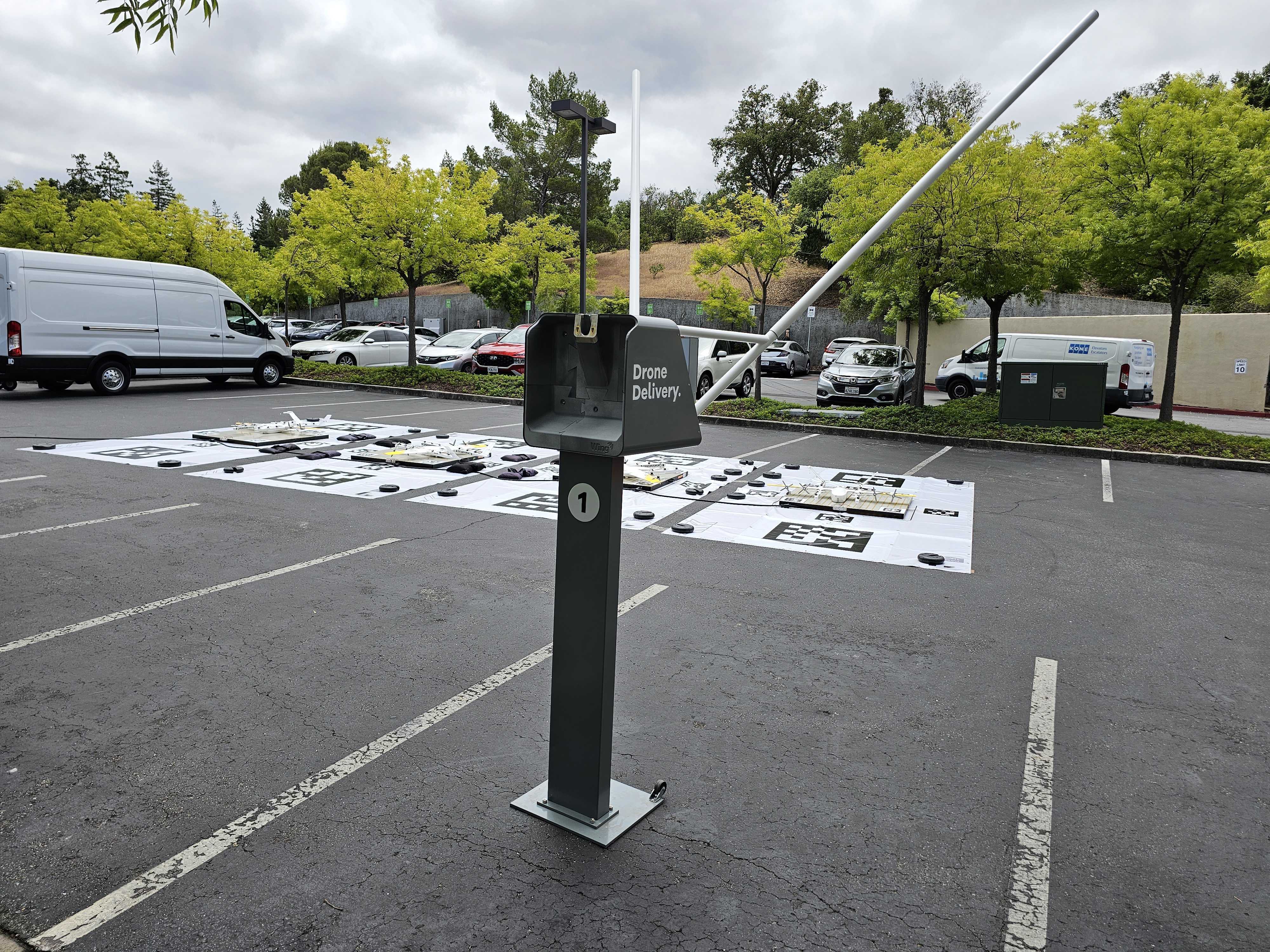 The AutoLoader name misleads slightly. It’s actually a fully passive system with a minimal footprint designed to sit in a store’s parking lot. It’s about four feet tall, with a pair of (much taller) PVC poles that jut out like antlers. The image I took above is of a final version of the system. It’s more or less the same hardware as the kind you see in Wing’s demos, but recolored and badged with the company’s branding.