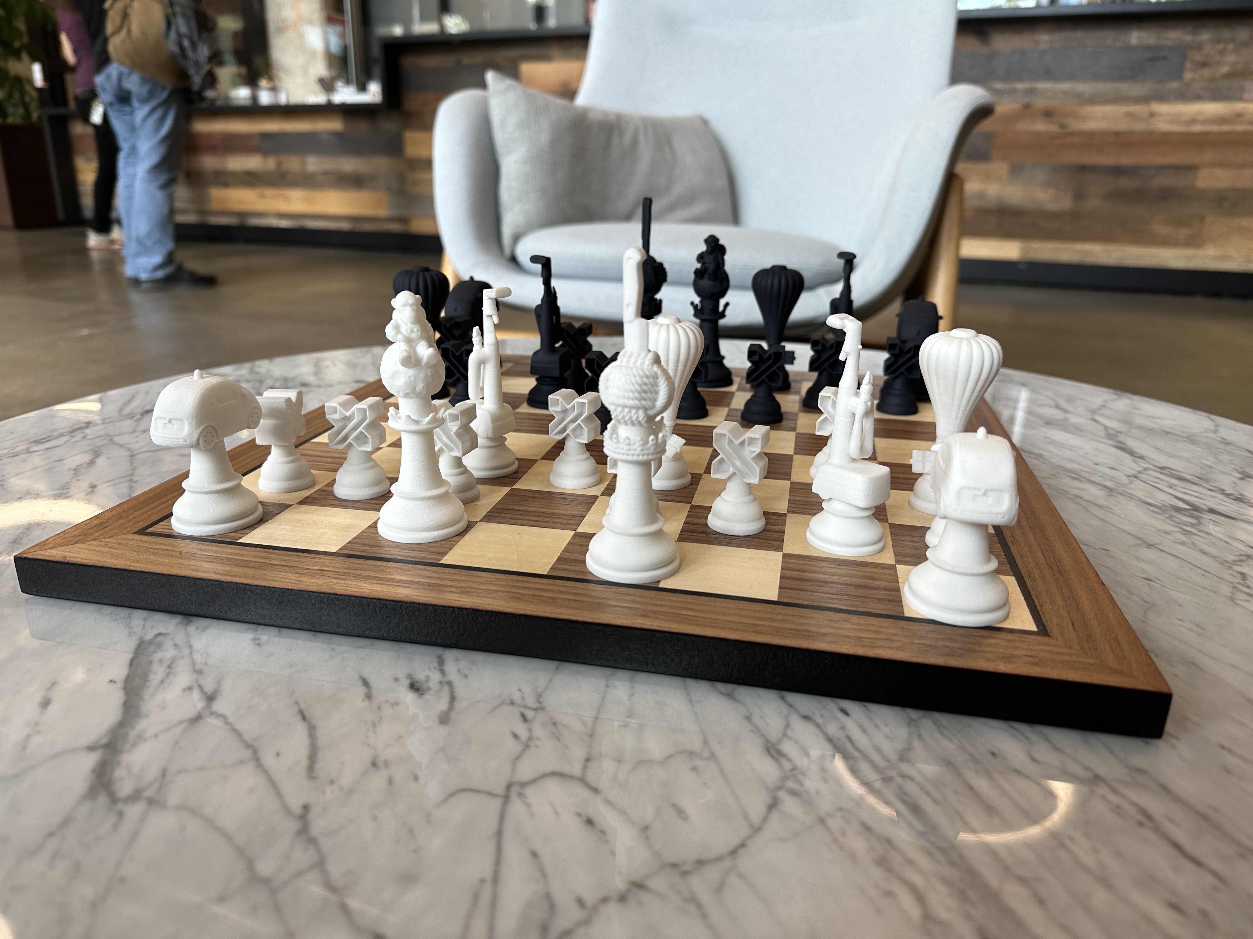 Things have been retrofitted, of course. Escalators were turned into stairways, the carpeted mall aesthetic has given way to a reclaimed wood and Edison-style LED bulb coffee shop vibe, outfitted with all mod startup cons. We went for lunch in the cafeteria, and I made a salad next to the metal conveyor belt sushi bar. On a table in the waiting area of the lobby sits a custom chess set, on which rests 3D-printed pieces, each representing Alphabet X companies and philosophies, like the Monkey Pedestal Problem. From a blog post published the year after the company moved into the space: