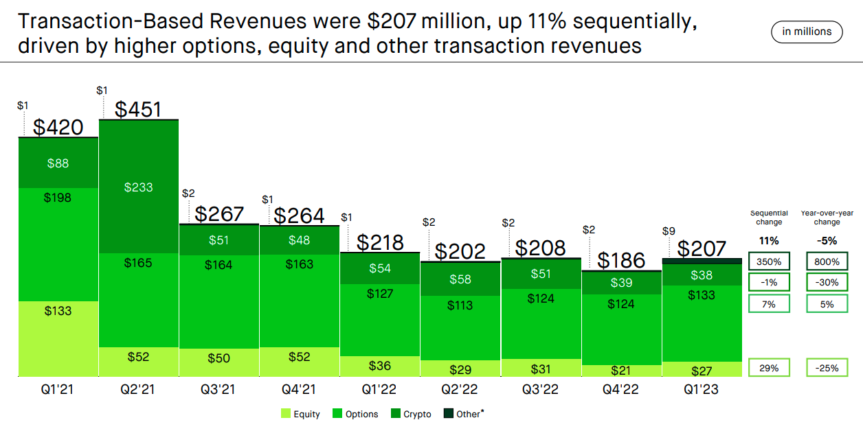 Let’s look at Robinhood’s Q1 2023 results to get a better idea. Observe the following historical breakdown of the company’s transaction revenues: