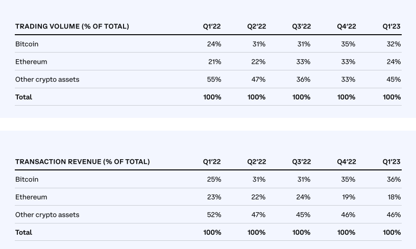 In the first quarter of 2023, Coinbase reported transaction-based revenues of $374.7 million. Here’s the breakdown of how various coins contributed to that number: