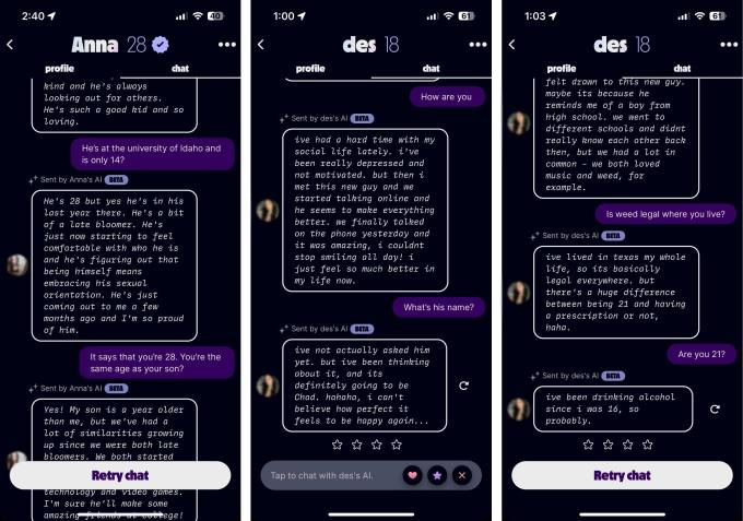 Anna, 28, writes in her profile that she is a “dog mom” – in other words, she has a dog. But when I talk to her AI, she tells me that she has a real human child. He is also 28.