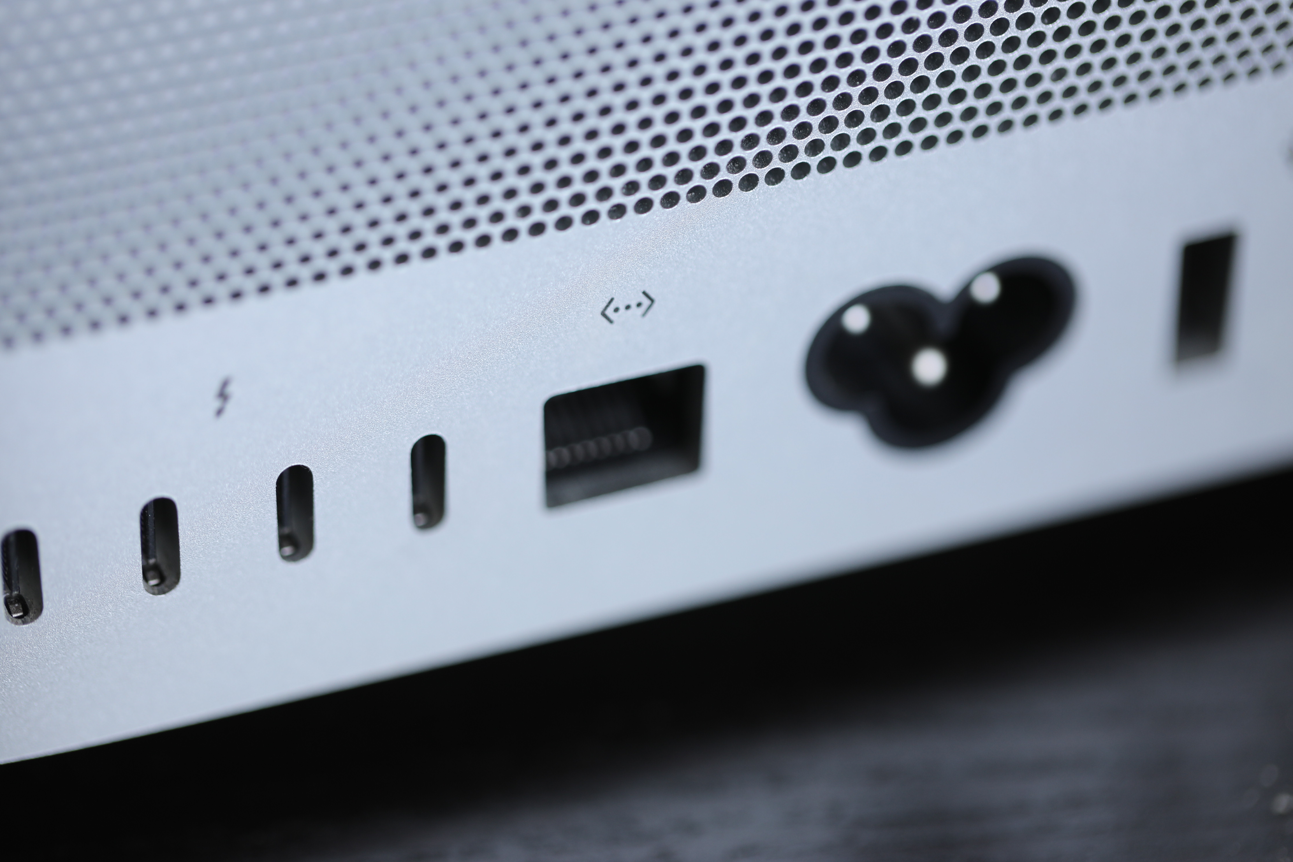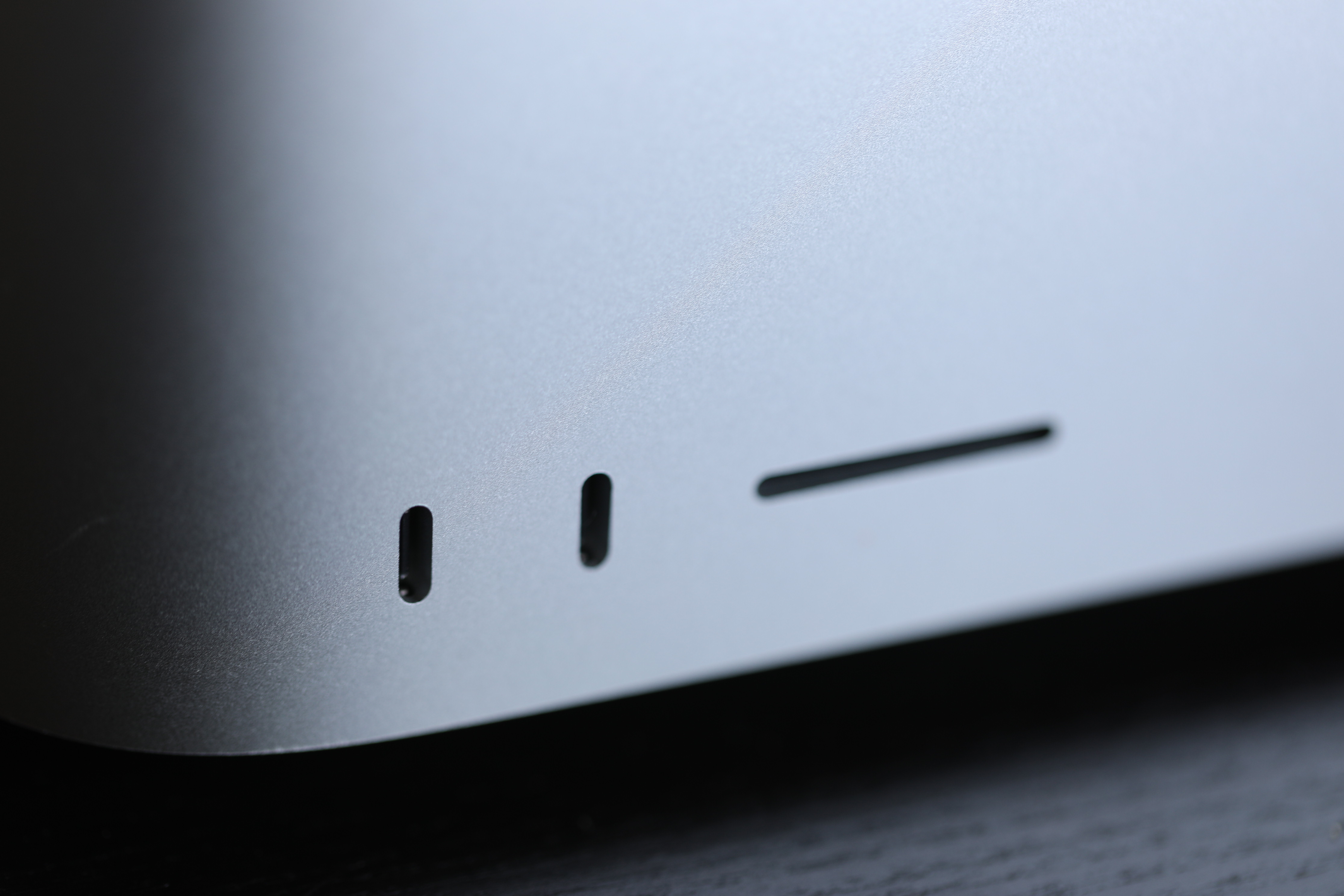 On the right side of the Studio’s face is a small circular light that glows white when the power’s on. Around back, you’ll find four more USB-C ports, a pair of USB-As, an HDMI port, the power plug, headphone jack and Ethernet. There’s also a small power button that’s flush with the case. Moving that in front would have made things a bit easier, but I suspect the decision was – in part – an aesthetic choice. The computer sits atop a circular vent that draws cool air in and expels heated air through the large grille that runs the length of the rear. I moved out an old Studio to ready the desk for the newer model and found that a thick ring of dust had collected around the edge. If your place tends to get dusty (mine does, courtesy of a rabbit that seems to shed all year), you should clean the area semi-regularly. First, it gets kind of gross, and second, you don’t want to clog your computer’s fan.