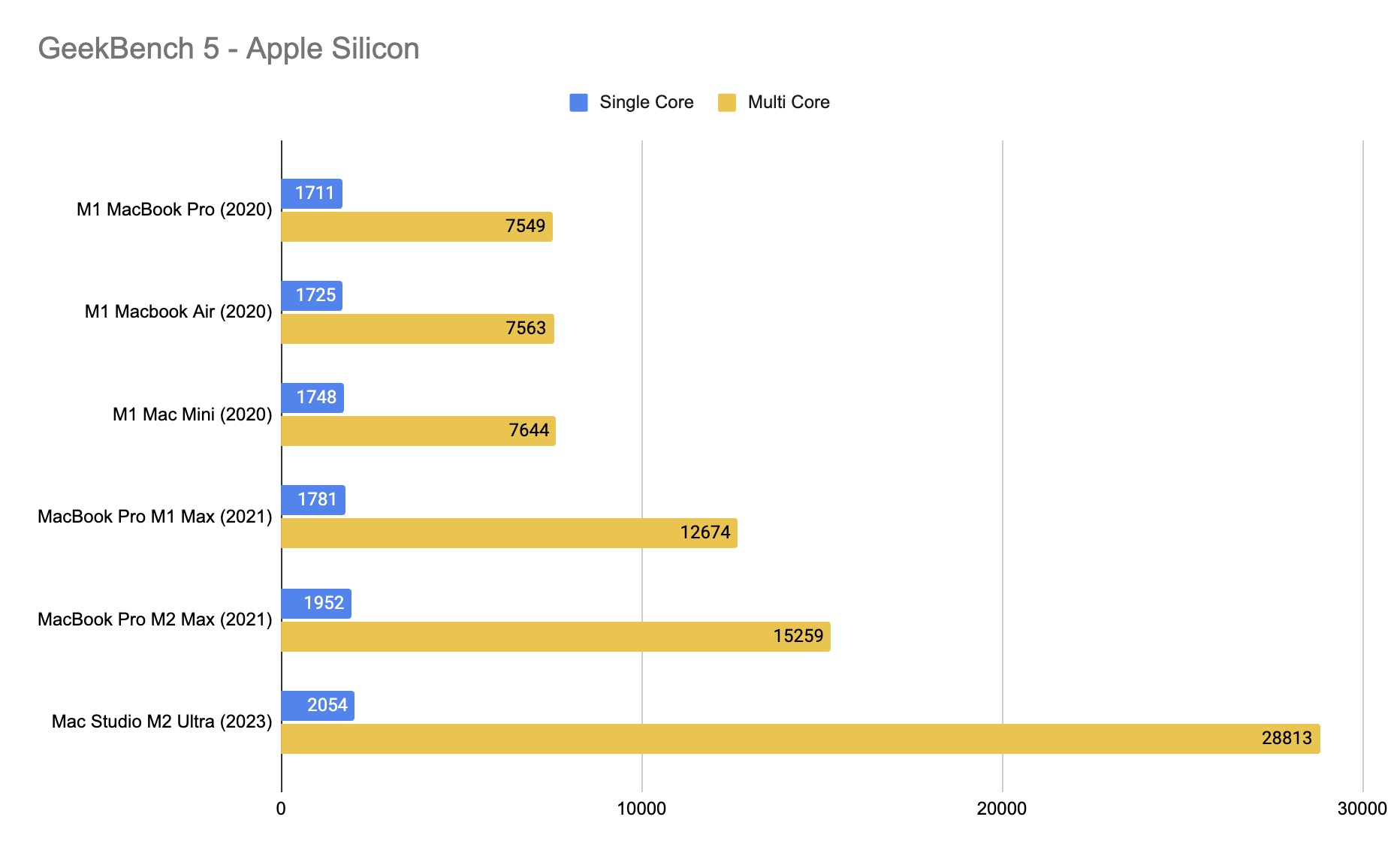 Performance numbers have been something to behold in my benchmarking thus far. The M2 Ultra Mac Studio scored an average of 2,054 on single-core and 28,813 on multi-core in Geekbench 5; compare that to the 1790 and 12,851 on our M1 Max Mac Studio tests last year.