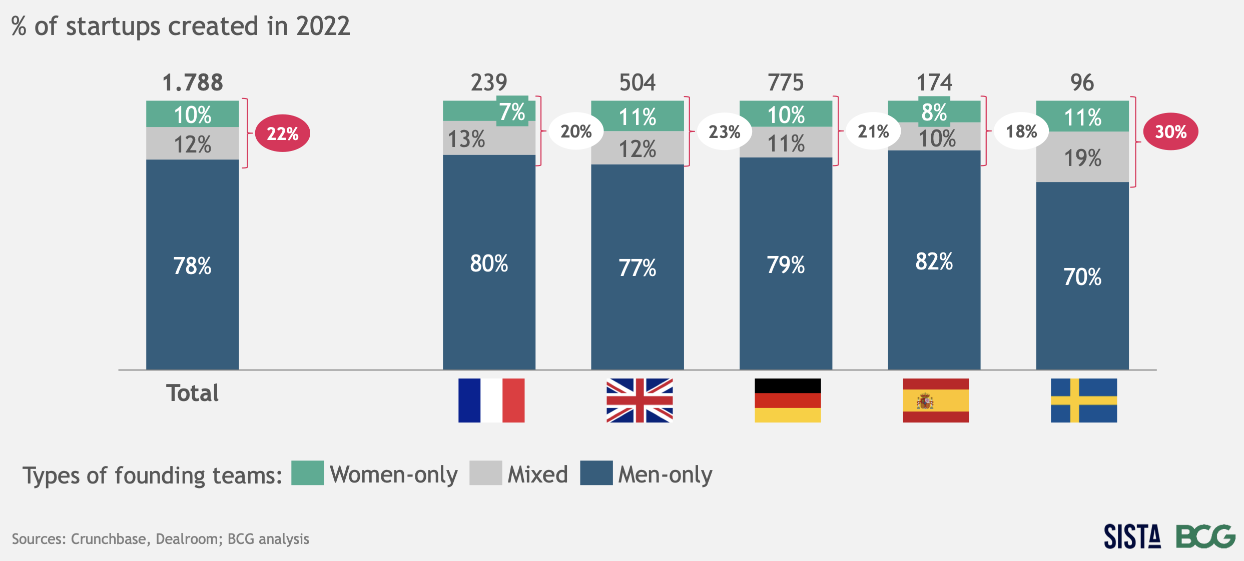 According to a new study from Sista and the Boston Consulting Group, women are still underrepresented in the European tech ecosystem. Only 22% of startups created in 2022 included a woman on the founding team. And when you look at women-only founding teams, that number drops to 10%. That means that, yes, 78% of European startups founded in 2022 only had male founders.