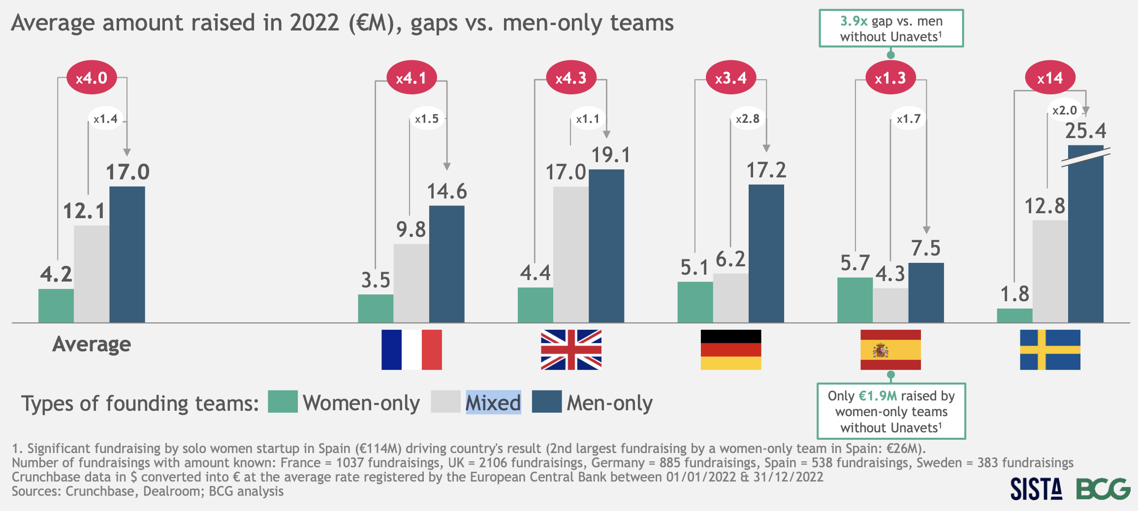 Startups with at least one women founder fare better. In 2022, mixed teams raised €12.1 million on average while men-only teams raised €17 million. As for women-only teams, investors only chose to invest an average of €4.2 million on those companies.
