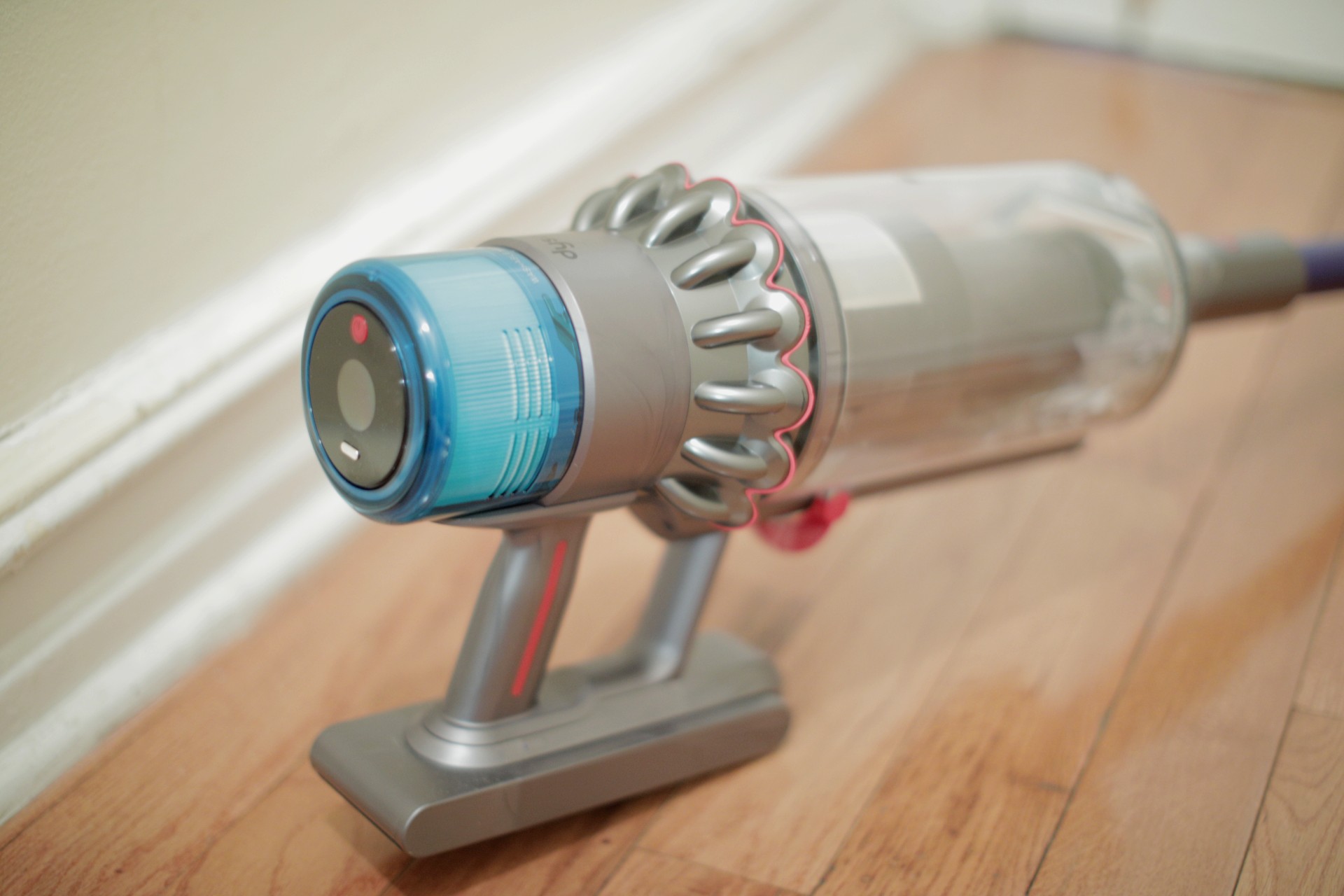 Another key design difference between this system and the V10 is the absence of a trigger. Not gonna lie, I miss it a bit. It’s just satisfying to pull the trigger on a vacuum and feeling that kickback. I have no taste for guns, but appreciate a bit of excitement with my cleaning appliances. I understand why it’s gone, though. For one thing, fewer moving parts on the outside means fewer opportunities for breakage. Even with the included wall mount, vacuums get dinged up and knocked over. You tip them, they drop and have to land somewhere. Few moving parts mean fewer potential pain points.