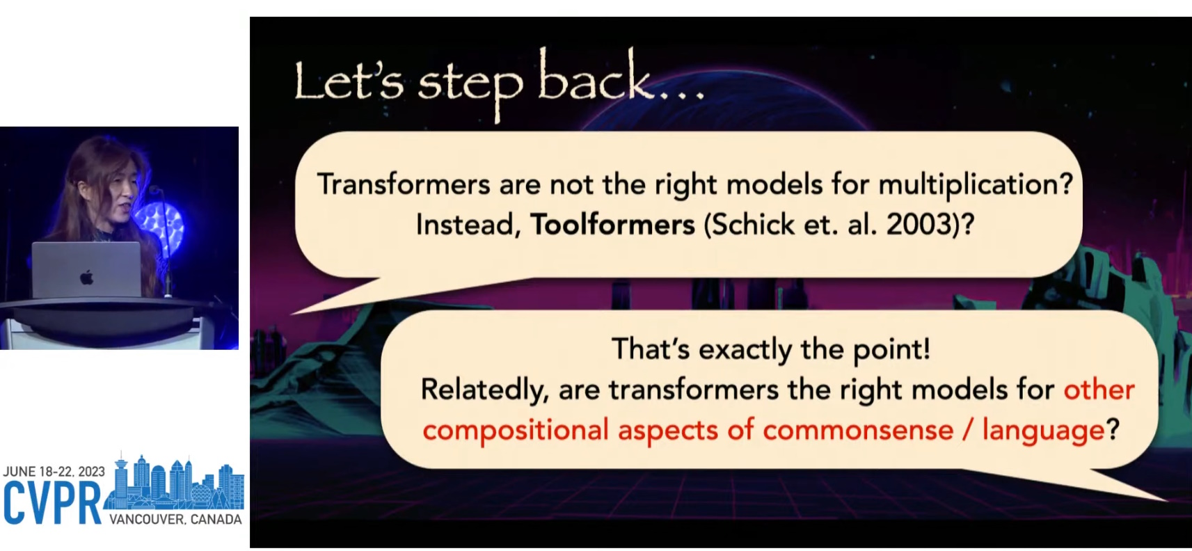 The UW professor and MacArthur Genius Grant recipient first addressed a few unexpected limitations of today’s most capable models. In particular, GPT-4 is really bad at multiplication. It fails to find the product of two three-digit numbers correctly at a surprising rate, though with a little coaxing it can get it right 95% of the time. Why does it matter that a language model can’t do math, you ask? Because the entire AI market right now is predicated on the idea that language models generalize well to lots of interesting tasks, including stuff like doing your taxes or accounting. Choi’s point was that we should be looking for the limitations of AI and working inward, not vice versa, as it tells us more about their capabilities.