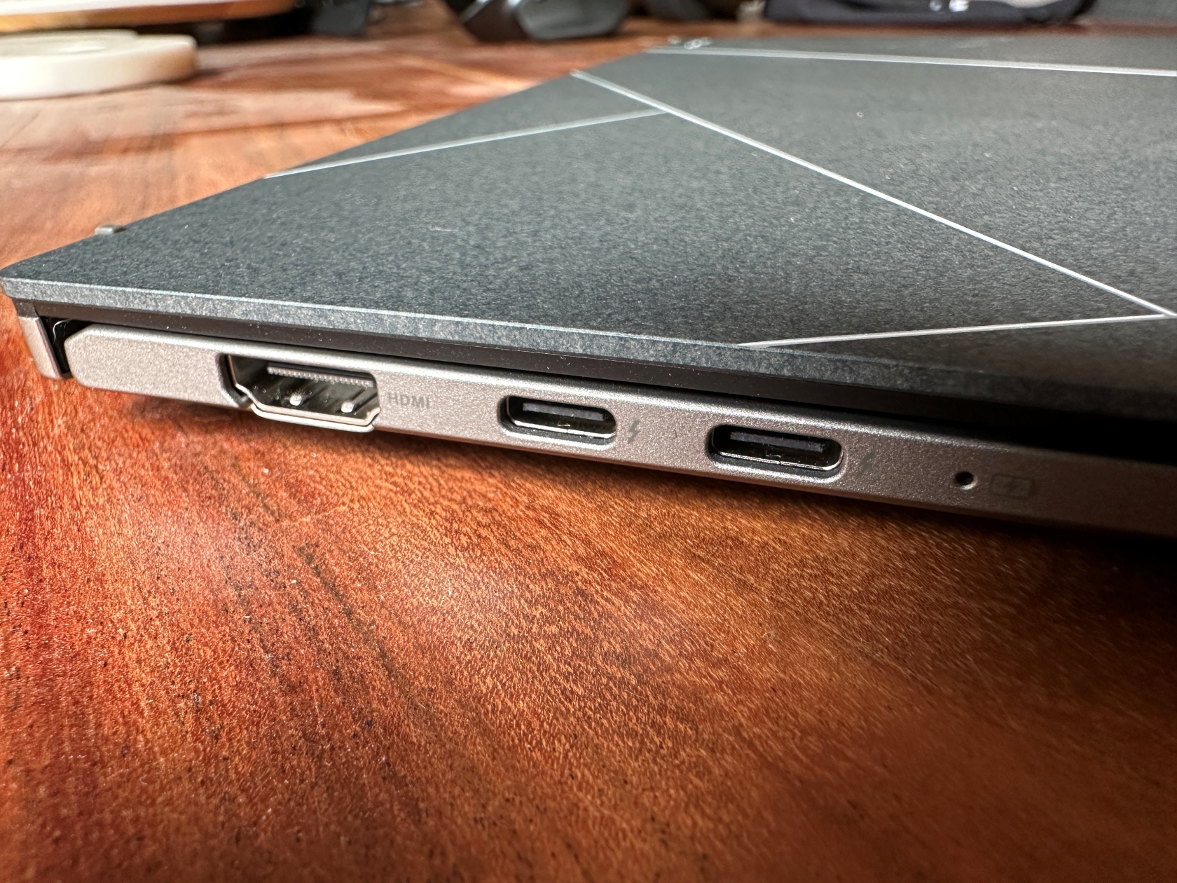 The 13th Gen Intel chip powering the 2023 Zenbook S 13 provides plenty of pep, and it comes with 16 GB of onboard memory and a fast 1TB SSD so it’ll never feel pokey. The trade-off for the power comes in the form of heat, which Asus mostly effectively dissipates with the onboard fan system. “Mostly” being the key word, however. The notebook can get quite hot, especially around the back top middle of the bottom panel, and that can be hot enough that you might experience some discomfort using it as an actual laptop while wearing shorts. The heat seems to be short-lived when it does build up, though, even when using a more performance-oriented power profile and using an application like Photoshop as well as multiple browser tabs.