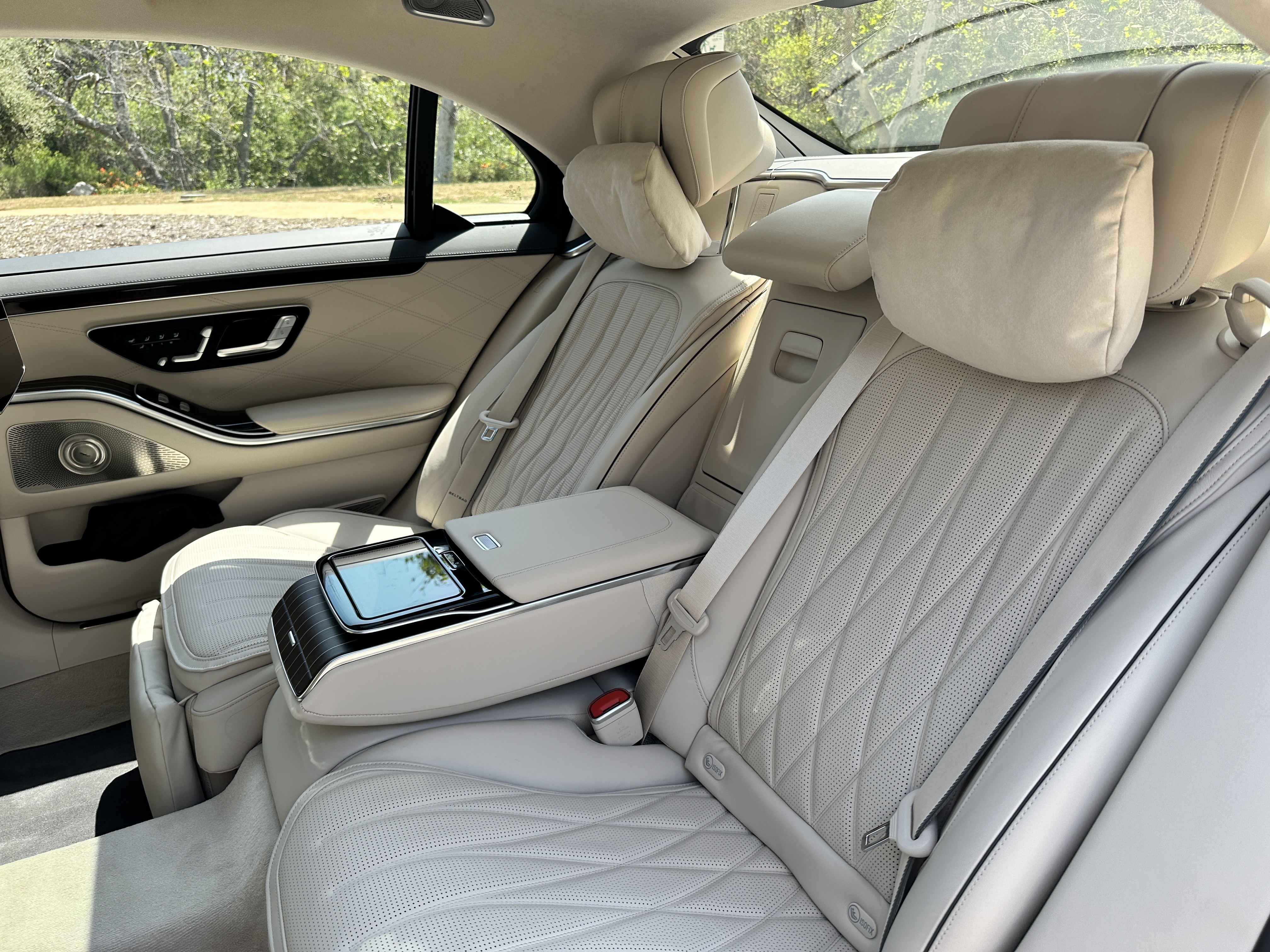 The rear seats, like the front, feature heating and cooling as well as massage. There’s also a cooler in back here to keep beverages nice and frosty as well as a small tablet to control the MBUX infotainment system.