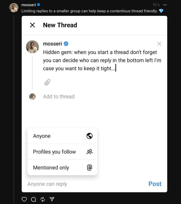 On Tuesday, Instagram head Adam Mosseri posted that users will be able to decide who can reply to posts — everyone, profiles they follow or accounts cited in the post.