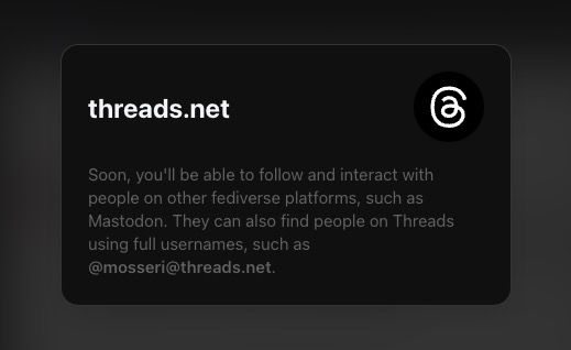 “Soon, you’ll be able to follow and interact with people on other fediverse platforms, such as Mastodon. They can also find people on Threads using full usernames, such as @mosseri@threads.net.”