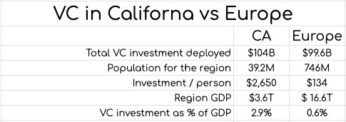 Looking to Silicon Valley might be a trope, but the San Francisco Bay Area is by far the most mature ecosystem around. California attracted more than $100 billion of venture investment in 2022. New York is in a distant second place with around $30 billion, followed by Massachusetts (or more specifically, Boston), with around $20 billion. Europe, in comparison, saw around $100 billion of investment in 2022. That sounds like a big number, but compare the size of the economy of Europe versus that of California.