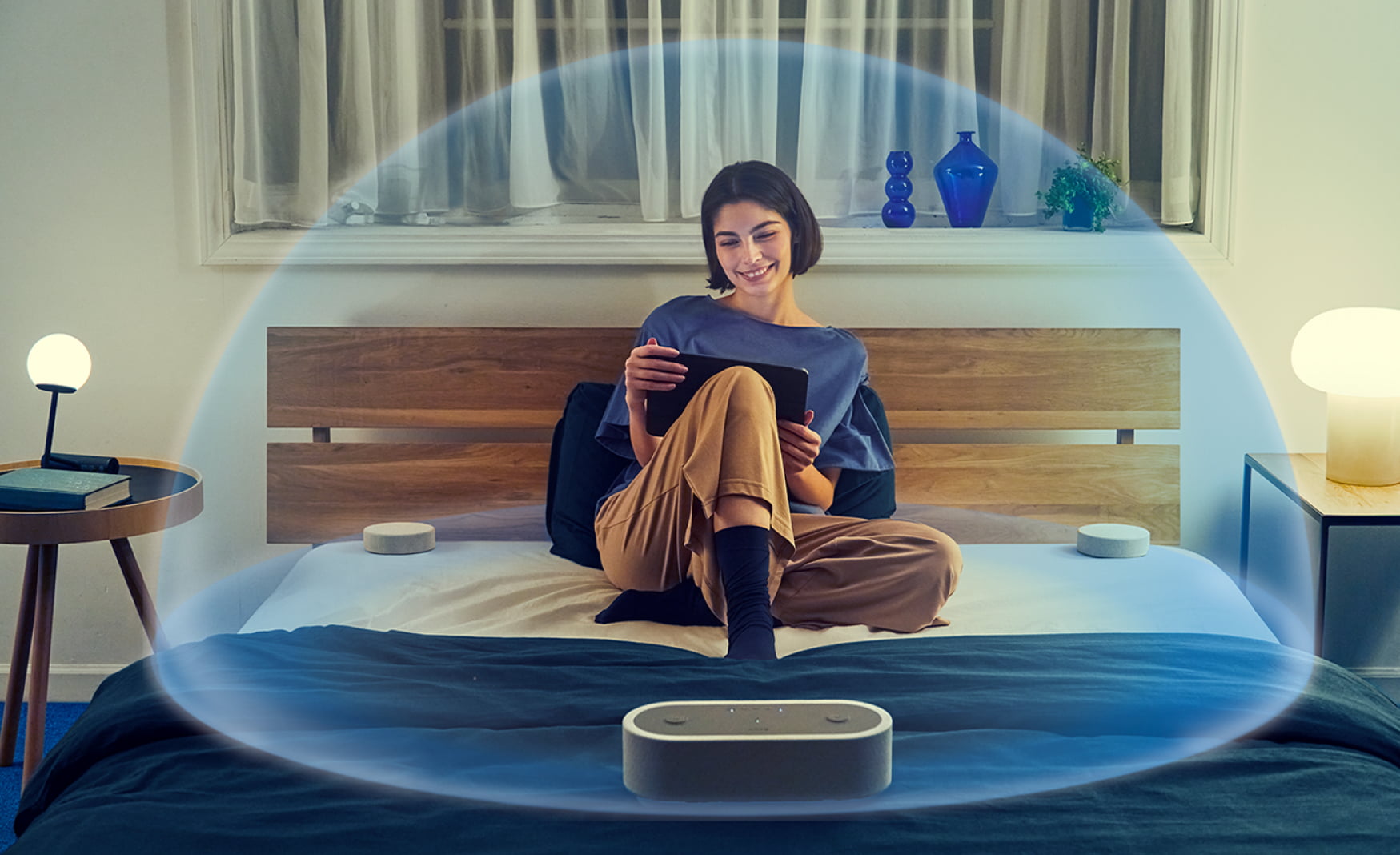 Unless your place is decked out with Sonos speakers in every room, you likely understand the experience of dragging Bluetooth speakers around your home. HT-AX7 is effectively a trio of speakers. The oblong base serves as the front speaker, while the detachable circular pair up top are the left and right rear. Pair it with a tablet, and suddenly you’ve got an immersive surround sound experience.
