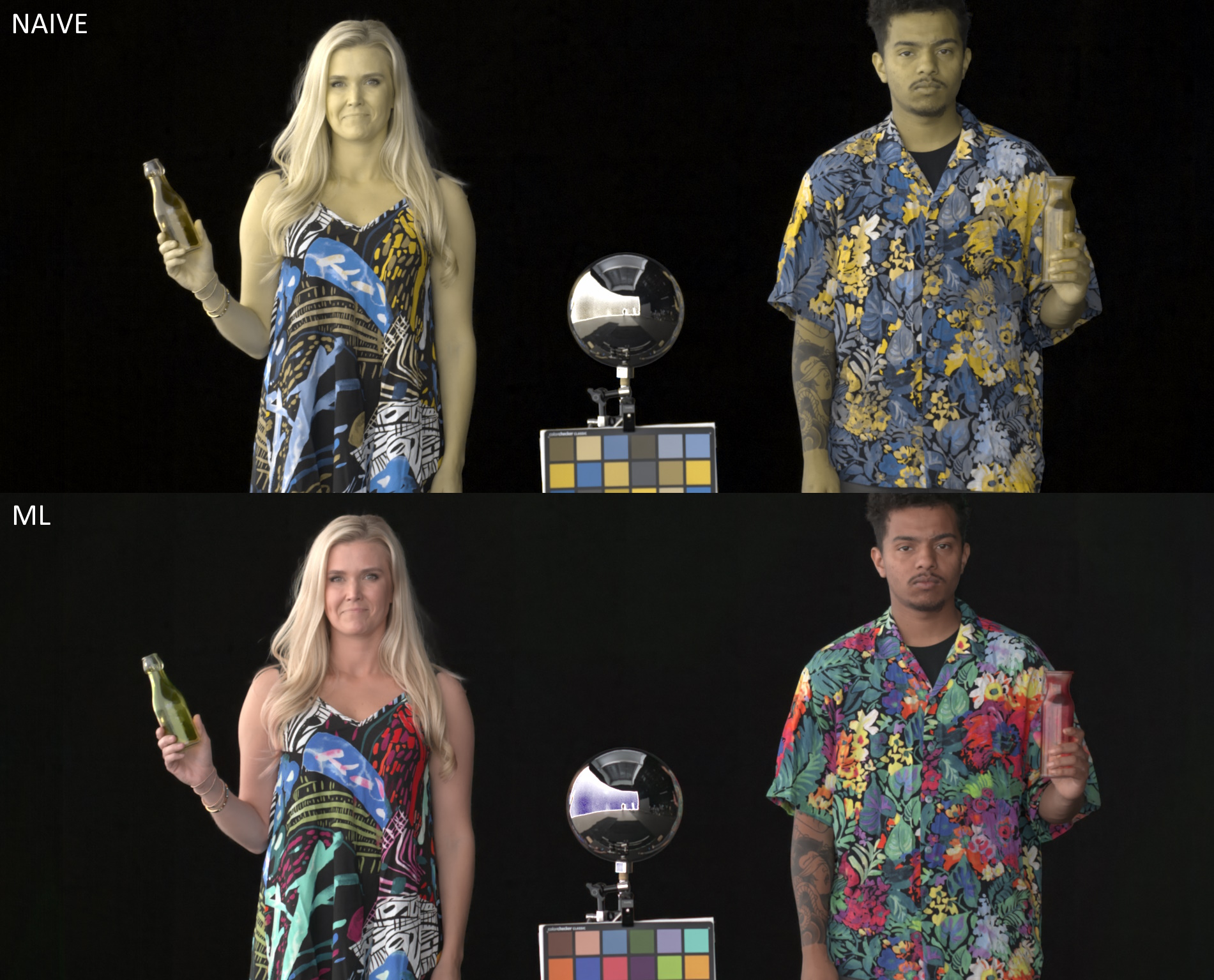So the color can be restored surprisingly well in post (it’s “virtually indistinguishable” from an in-camera ground truth) — but there’s still the problem of the actors and set having to be lit in this horrible way. Many actors already complain of how unnatural it is to work in front of a green screen — imagine doing it while lit in a harsh, inhuman light.