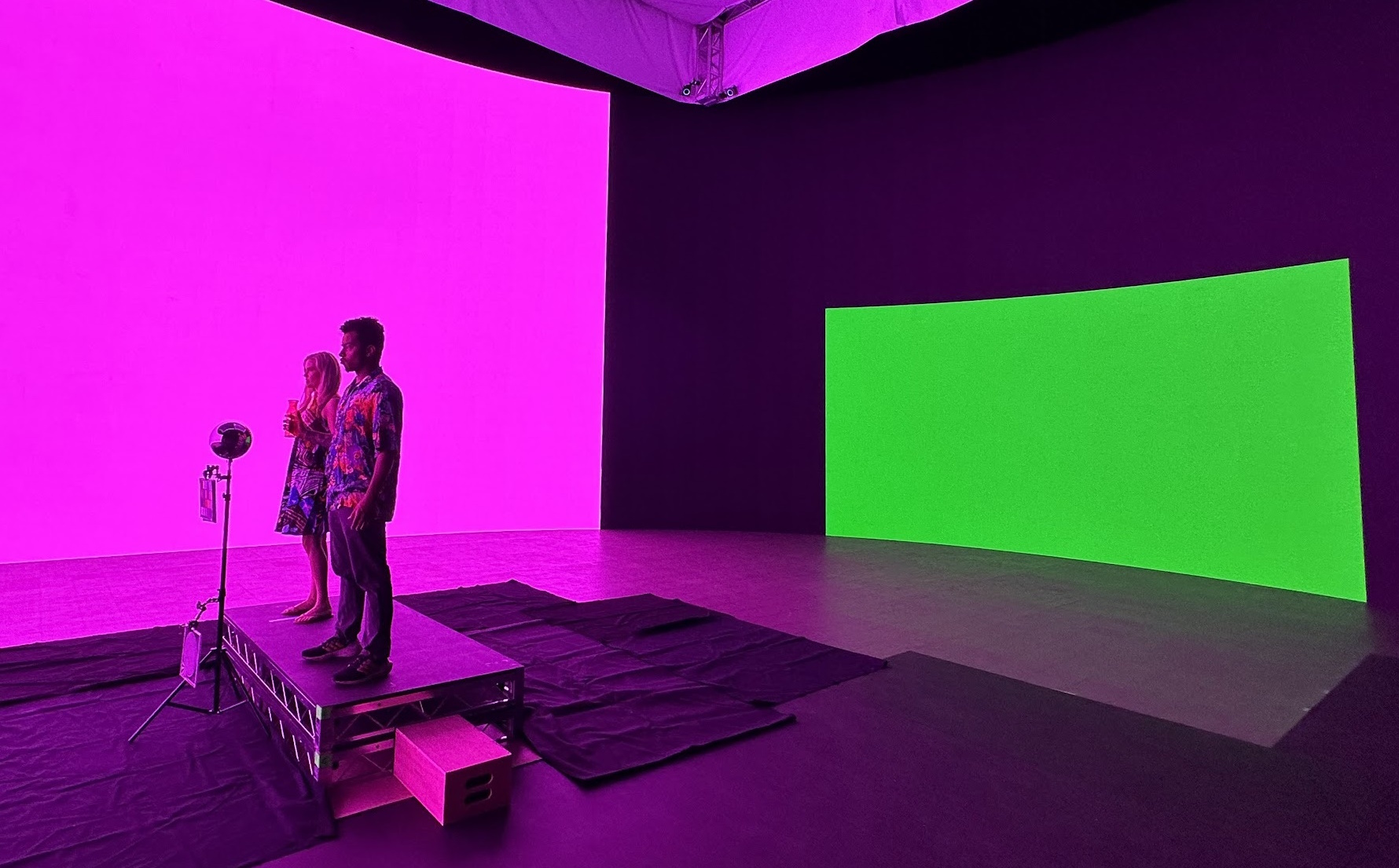As described in a recently published paper, their “Magenta Green Screen” produces impressive results by, essentially, putting the actors in a lighting sandwich. Behind them, bright green (actively lit, not a backdrop); in front, a mix of red and blue, making for a dramatically contrasting colors.