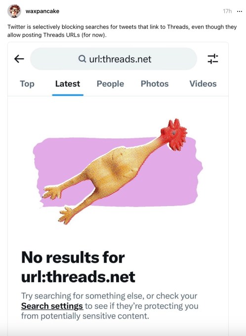 Technologist Andy Baio was among those who noticed the change on Twitter after performing a search using the operator “url:threads.net,” which returned no results. Typically, this search operator would pull in any tweets with links to the website specified — and there are plenty of tweets that have threads.net links now included.