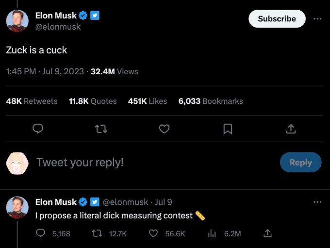 The animosity between the social media execs, Musk and Meta CEO Mark Zuckerberg, however, has heated up in recent days, with Musk earlier this month challenging Zuckerberg to a “cage match.” Over the weekend, the Twitter owner even resorted to name-calling, tweeting “Zuck is a cuck,” and crudely proposing a “literal dick measuring contest.”