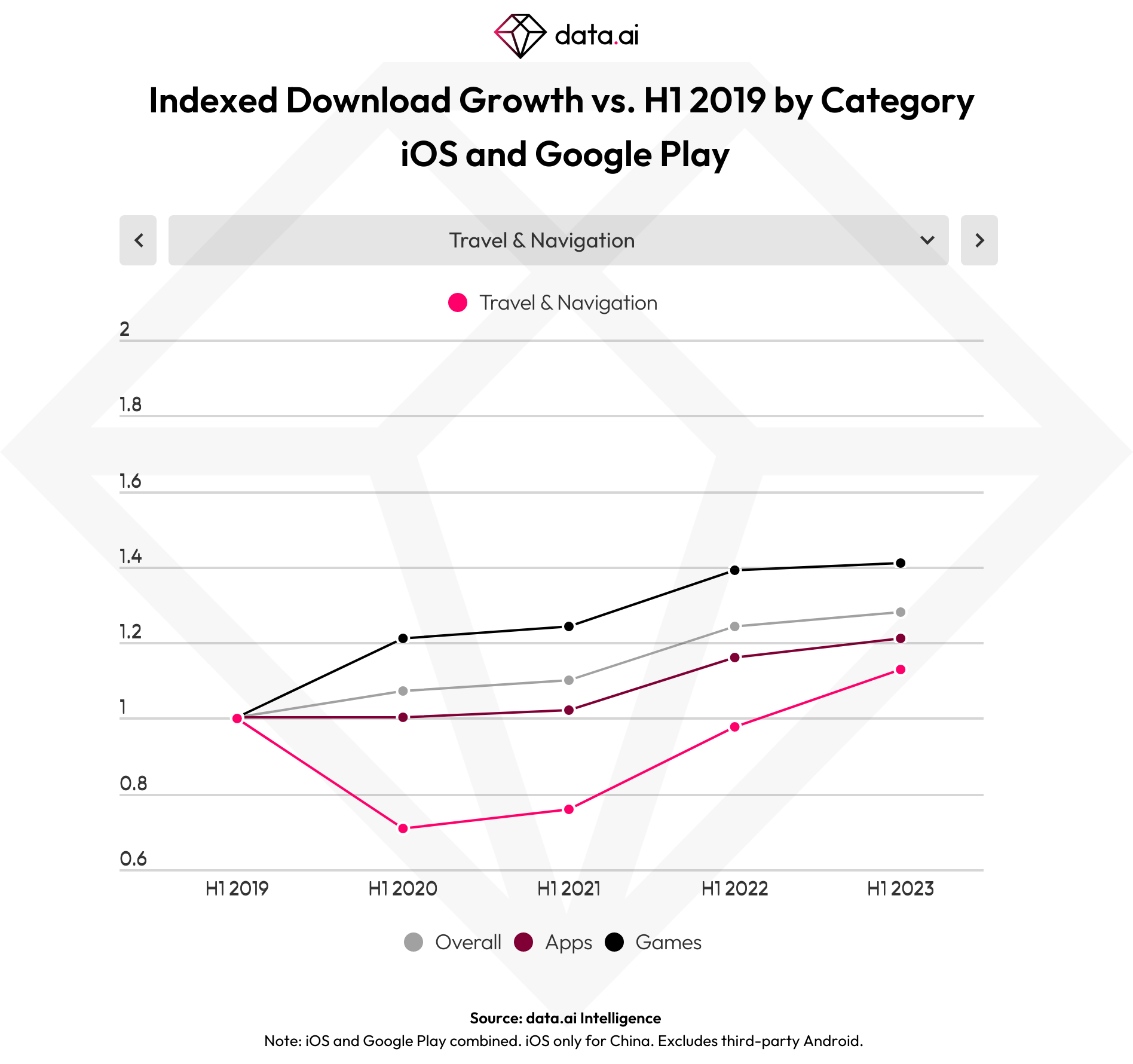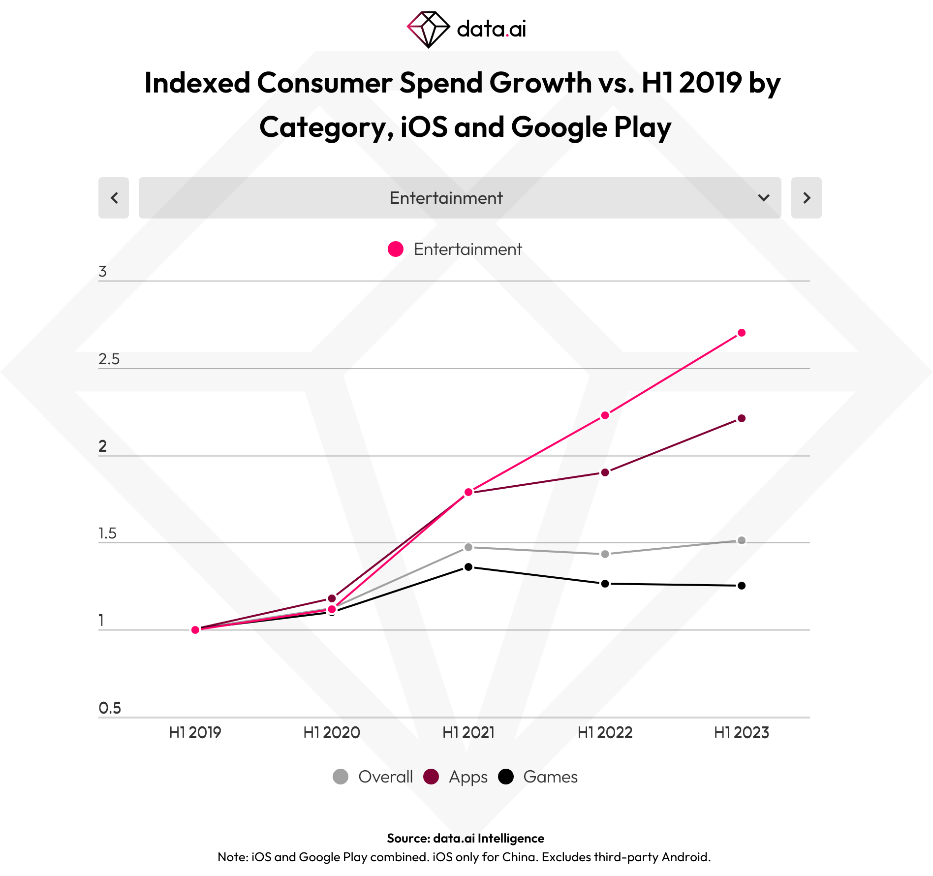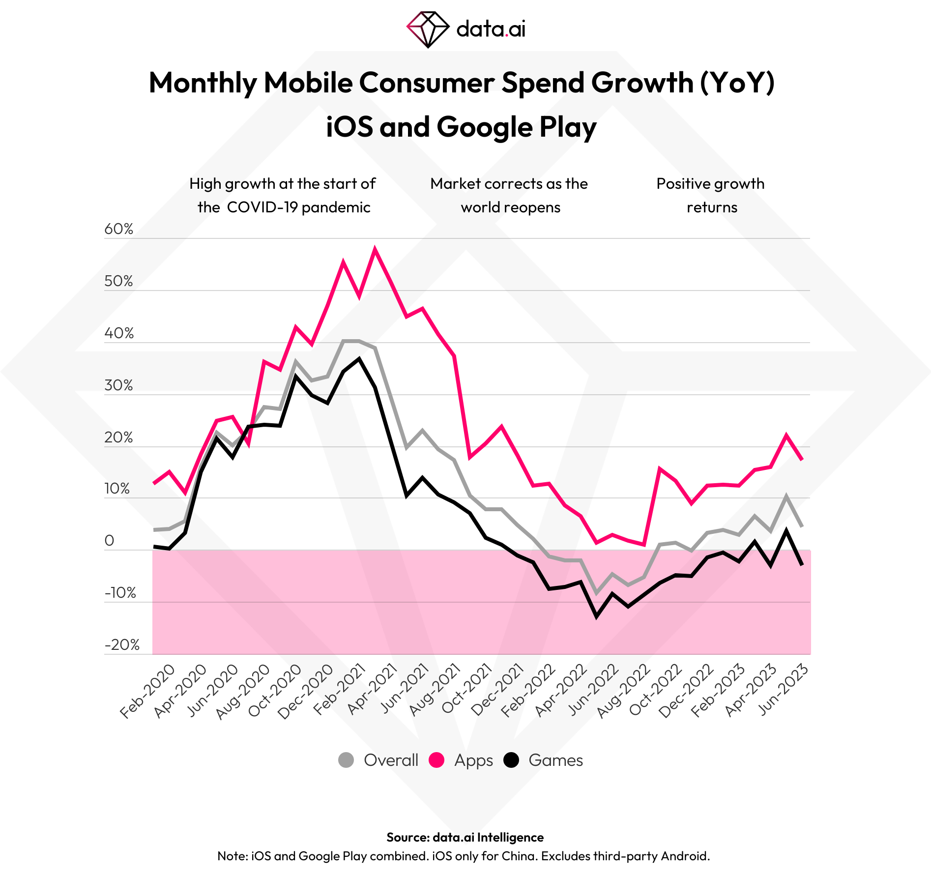 Consumer spending was up 5.3% year-over-year during the first half of 2023 with 16% growth in apps, while spending in mobile games remains roughly even, data.ai says. While the lack of growth in games could be concerning, the firm believes growth is likely to soon return to this segment of the market as positive growth had already been seen in March and May 2023 after an earlier low point of -13% in May 2022. The current growth rates for games look similar to that at the start of 2020, ahead of the COVID-19 pandemic, in fact.