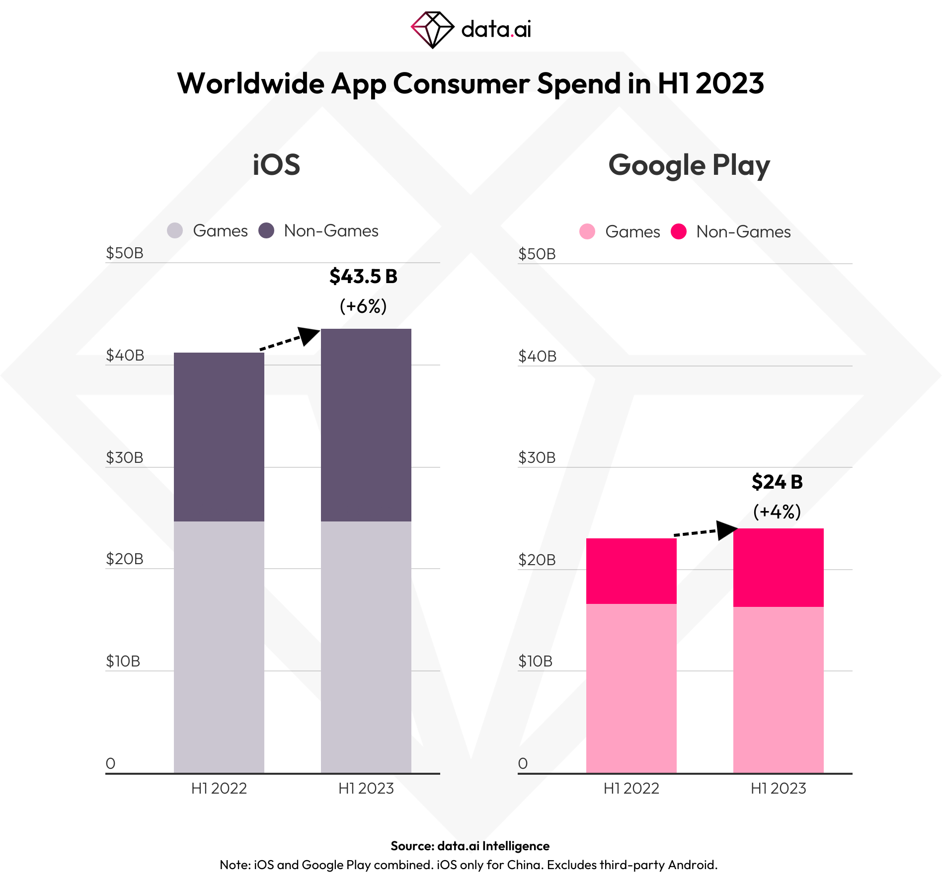 iOS growth was also ahead of that of Android, as consumer spending on the App Store was up 5.8% year-over-year in the first half of 2023, while Google Play grew 4.3%. That works out to $43.5 billion in consumer spending on iOS and $24 billion on Android. In addition, iOS accounts for nearly 65% of the total app store spending combined, and even higher in non-gaming apps, where it’s 71% of the spend.