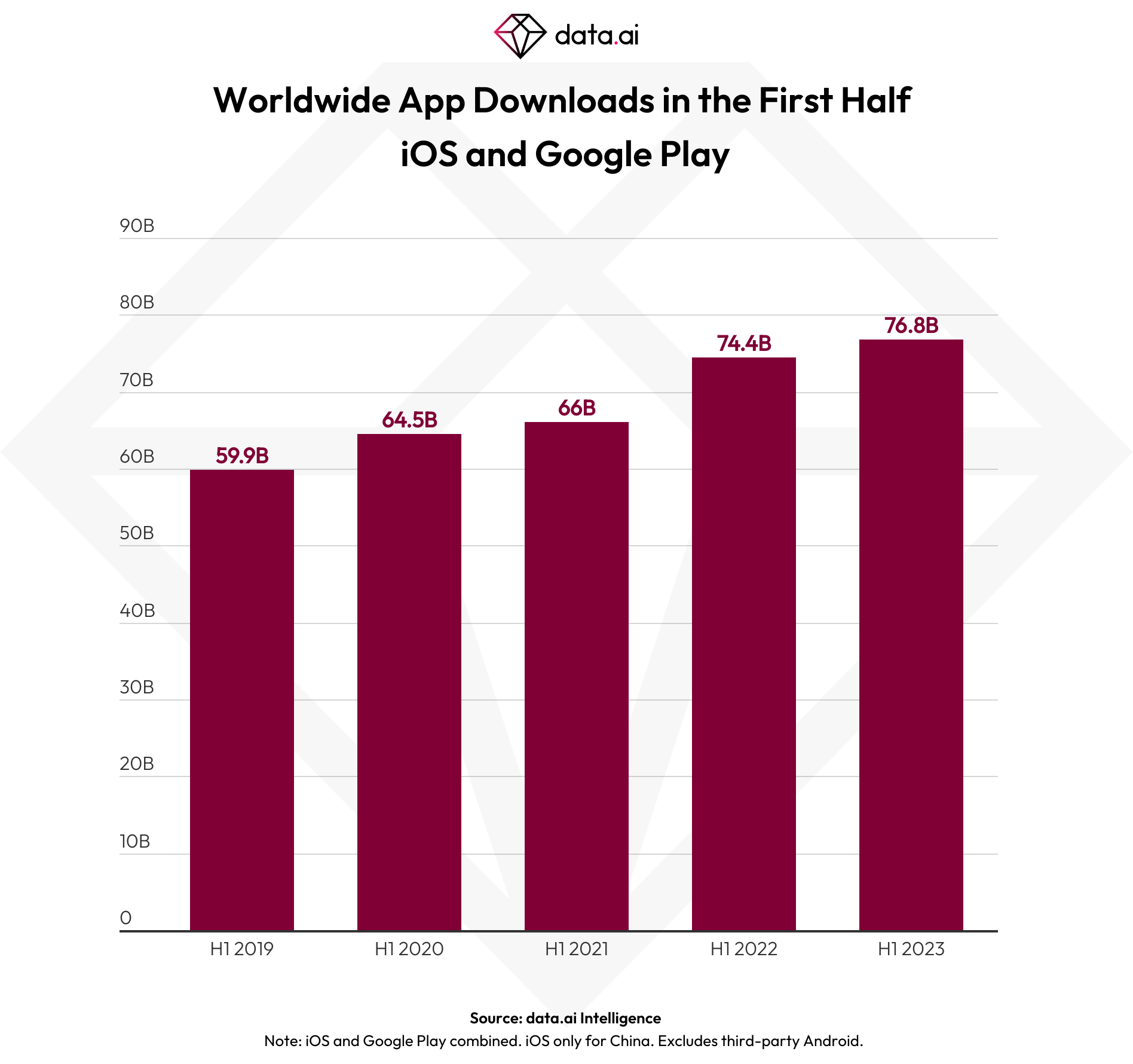 Another metric for app ecosystem health is mobile app and game downloads. These have continued to see growth with 76.8 billion new installs this year so far, which would be even with the second half of 2022 and up 3.2% year-over-year.