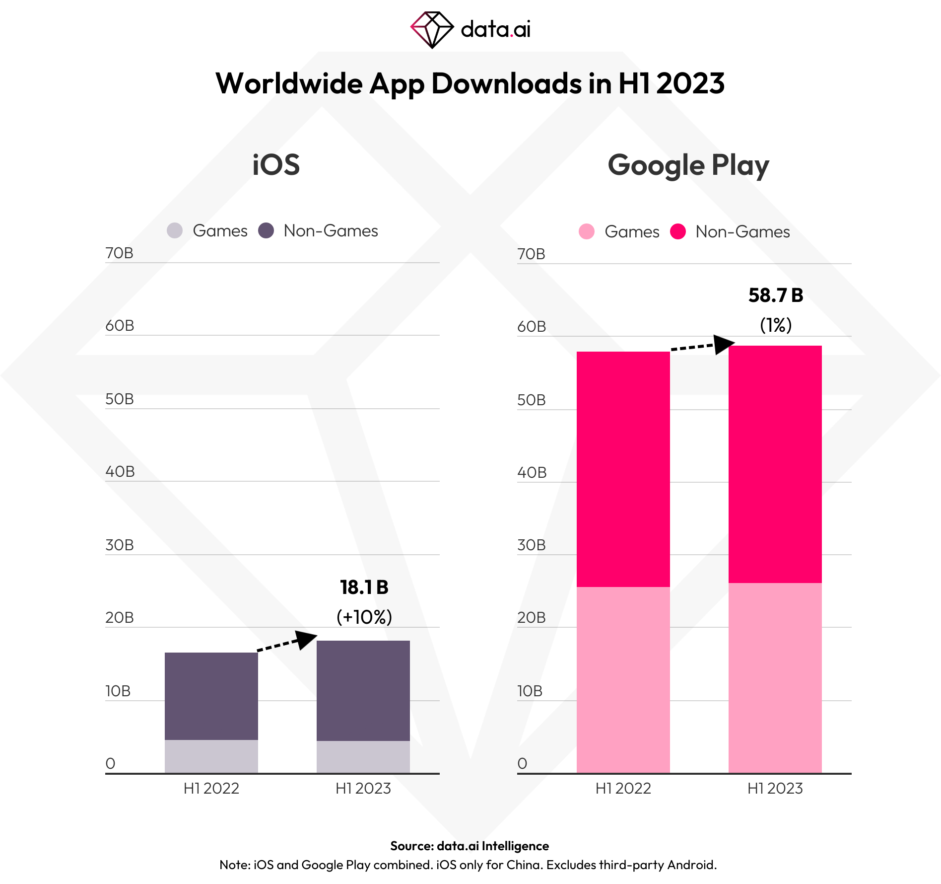 Download growth is faster on iOS, however, as installs grew 10% year-over-year to 18+ billion, while Google Play installs grew 1.4% year-over-year to 58.7 billion. China, the U.S. and Japan delivered the most iOS downloads, but in terms of growth, Brazil, China and the U.S. were the markets that delivered.