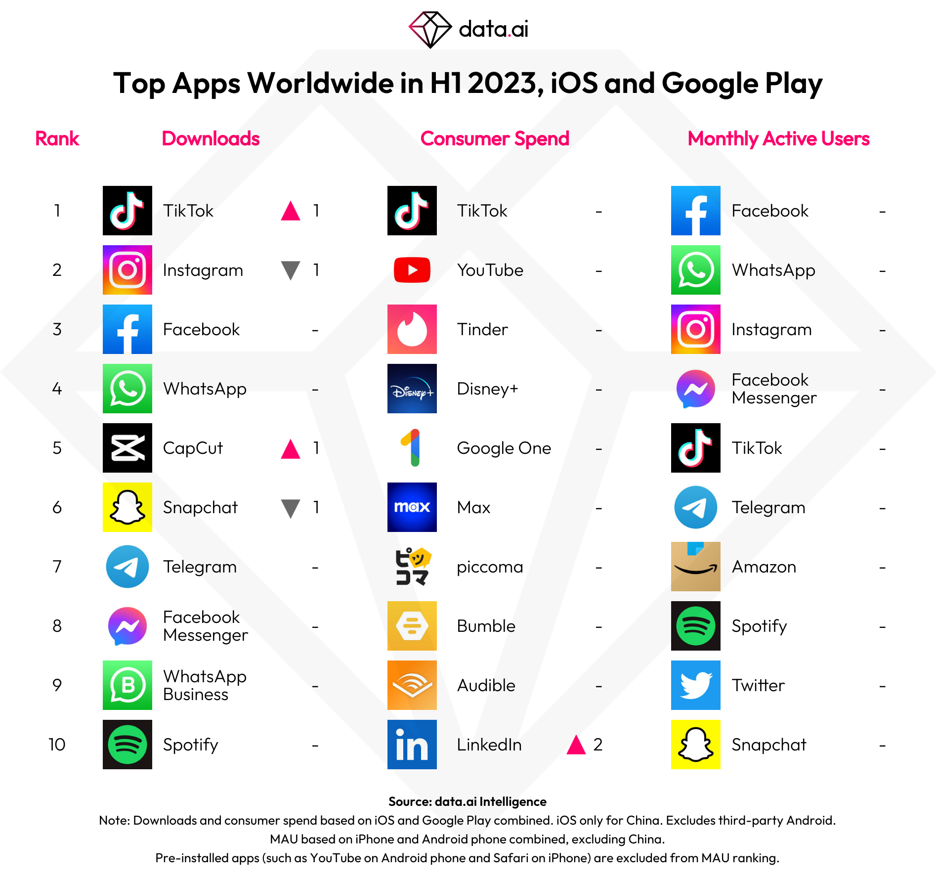 The top apps by downloads globally across both app stores included TikTok, Instagram, Facebook, WhatsApp, CapCut, Snapchat, Telegram, Messenger, WhatsApp Business and Spotify.