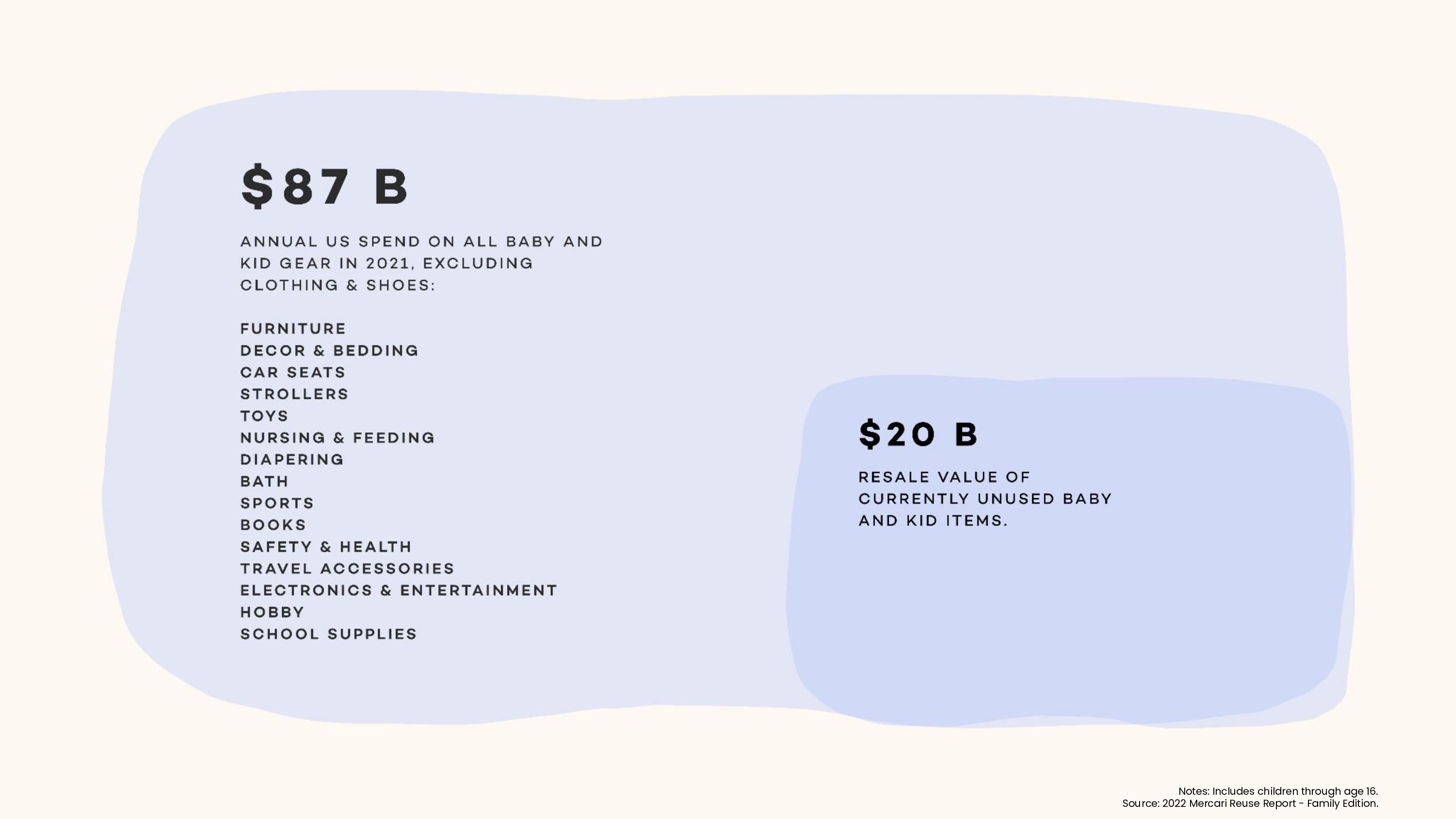 The smaller number is also suspect: This isn’t the SAM (serviceable available market) or the SOM (serviceable obtainable market); it’s the resale value of unused baby and children’s items. Retail value is iffy for exactly the reasons I describe in my article about SOMs. Unless you are an equipment manufacturer, your SOM is the markup — the revenue you can make here — and not the retail value.