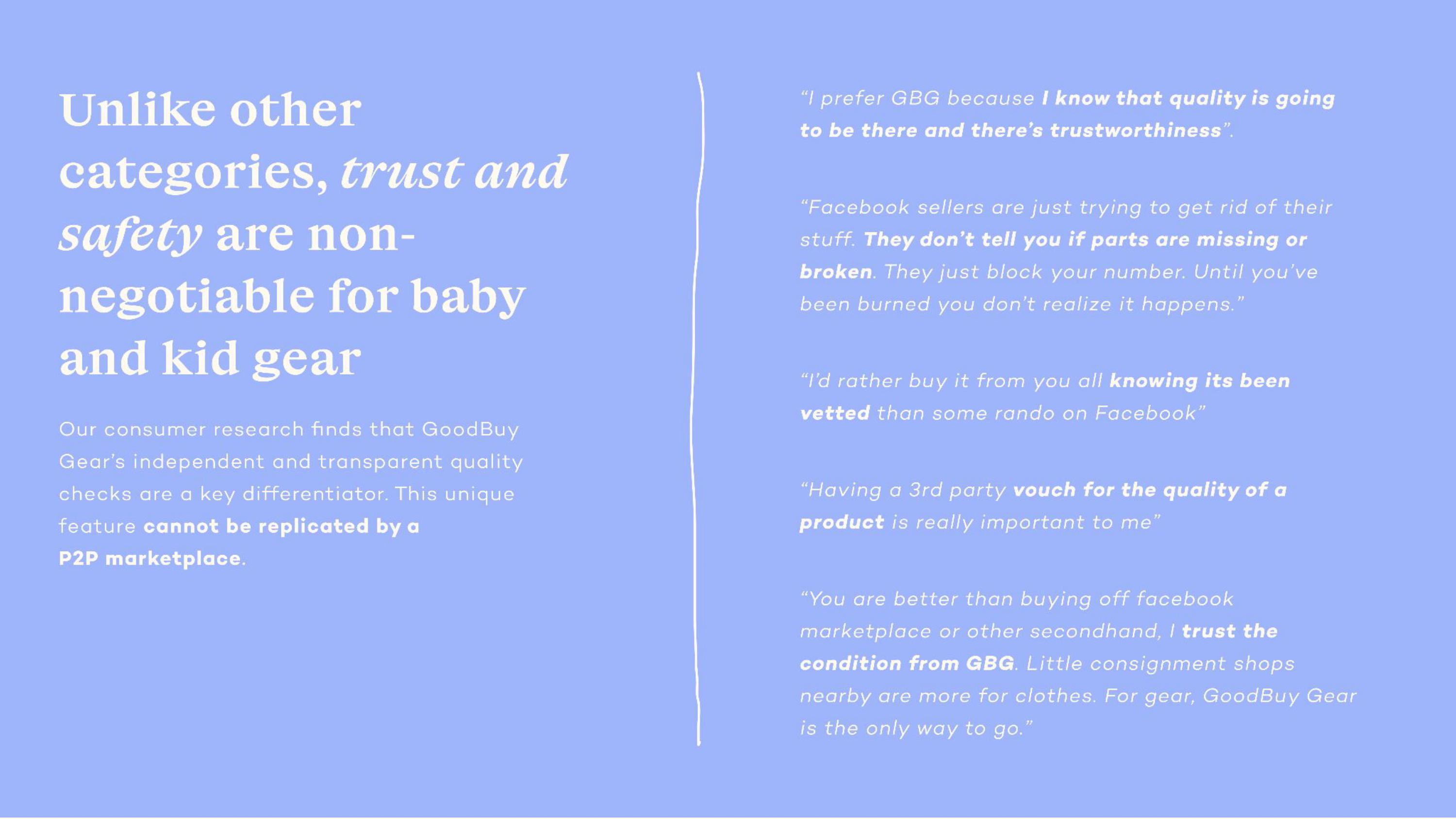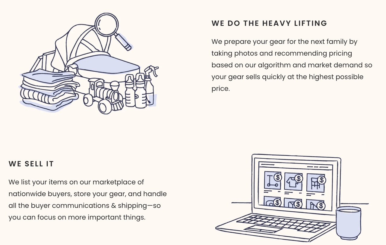 GoodBuy Gear’s business model is different from its peers: It vets the quality of the products and ensures that they are clean and of high quality. Busy parents don’t have time to deal with going to the post office, dealing with returns, so this service eradicates a lot of the hassle. Telling this part of the story through customer testimonials is smart. While I hate this white-on-light-blue wall of text, it does get the “why” of the message across.