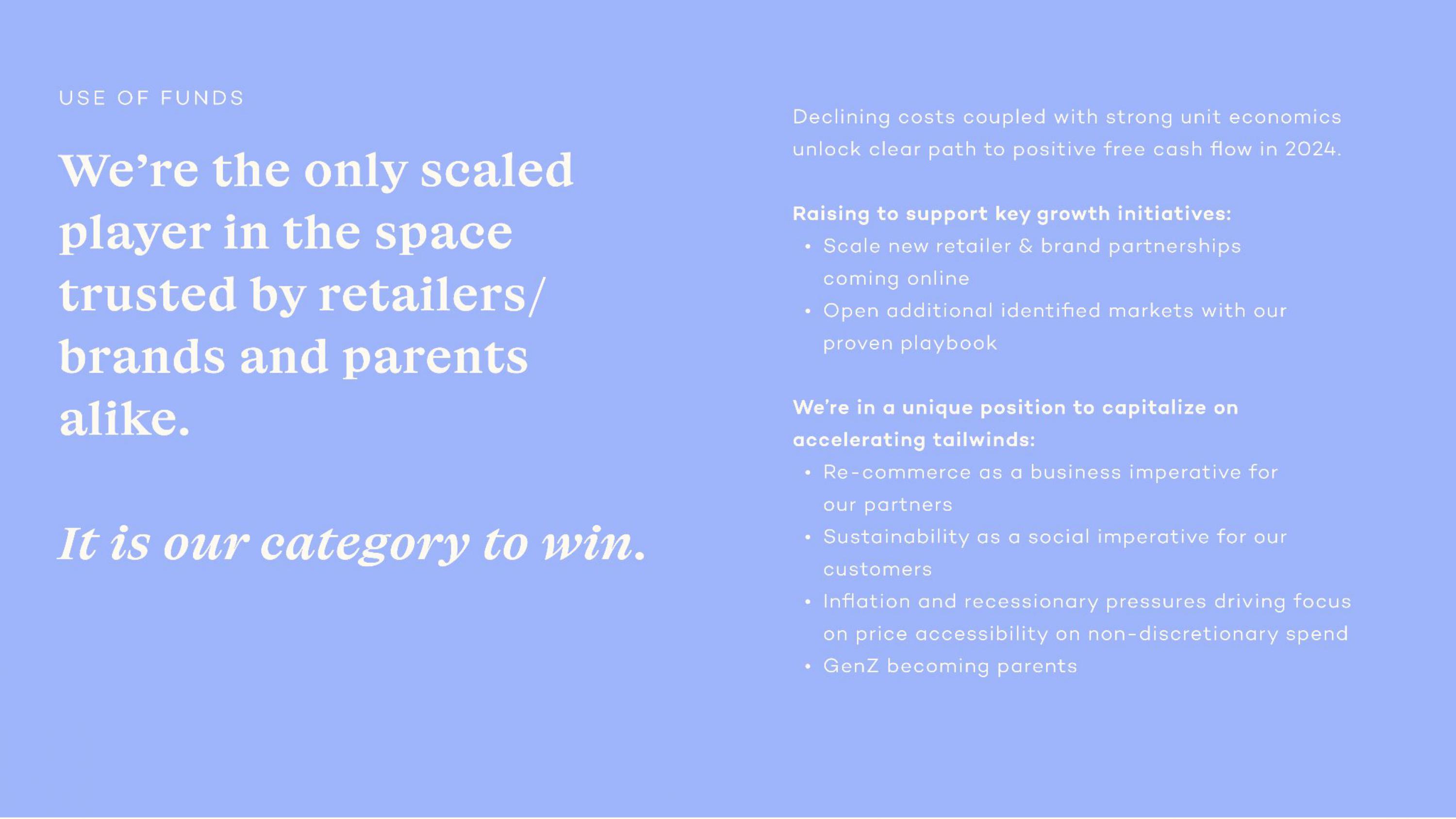 “It is our category to win,” the company claims, and I would love to be convinced that’s true. The problem is, this “use of funds” slide doesn’t actually say how the company is going to use the money to position itself for the next round of funding.