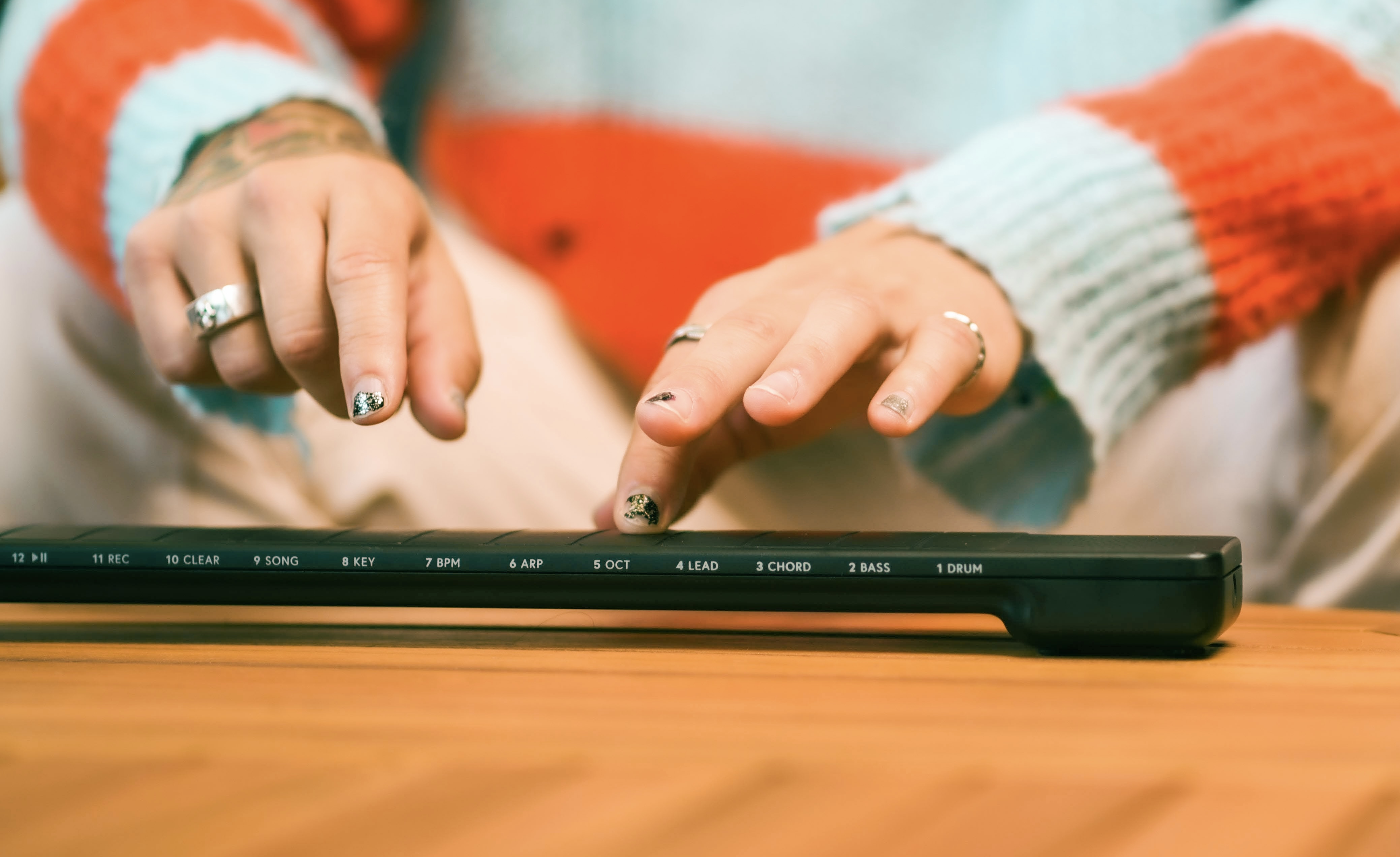 The instrument effectively integrates Orba’s pads into a guitar neck/keyboard style interface akin to the Instrument 1. As ever, the pitch is a diverse set of sounds that can be manipulated in a variety of ways. You can strum it like a guitar, tap it like a drum pad or play it like a piano.