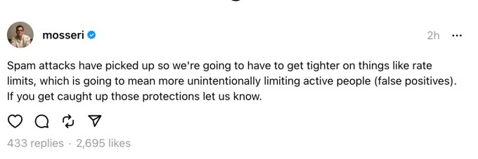 Instagram head Adam Mosseri explained the problem in a post on the Threads app this afternoon, noting that “Spam attacks have picked up so we’re going to have to get tighter on things like rate limits, which is going to mean more unintentionally limiting active people (false positives). If you get caught up [in] those protections let us know.”