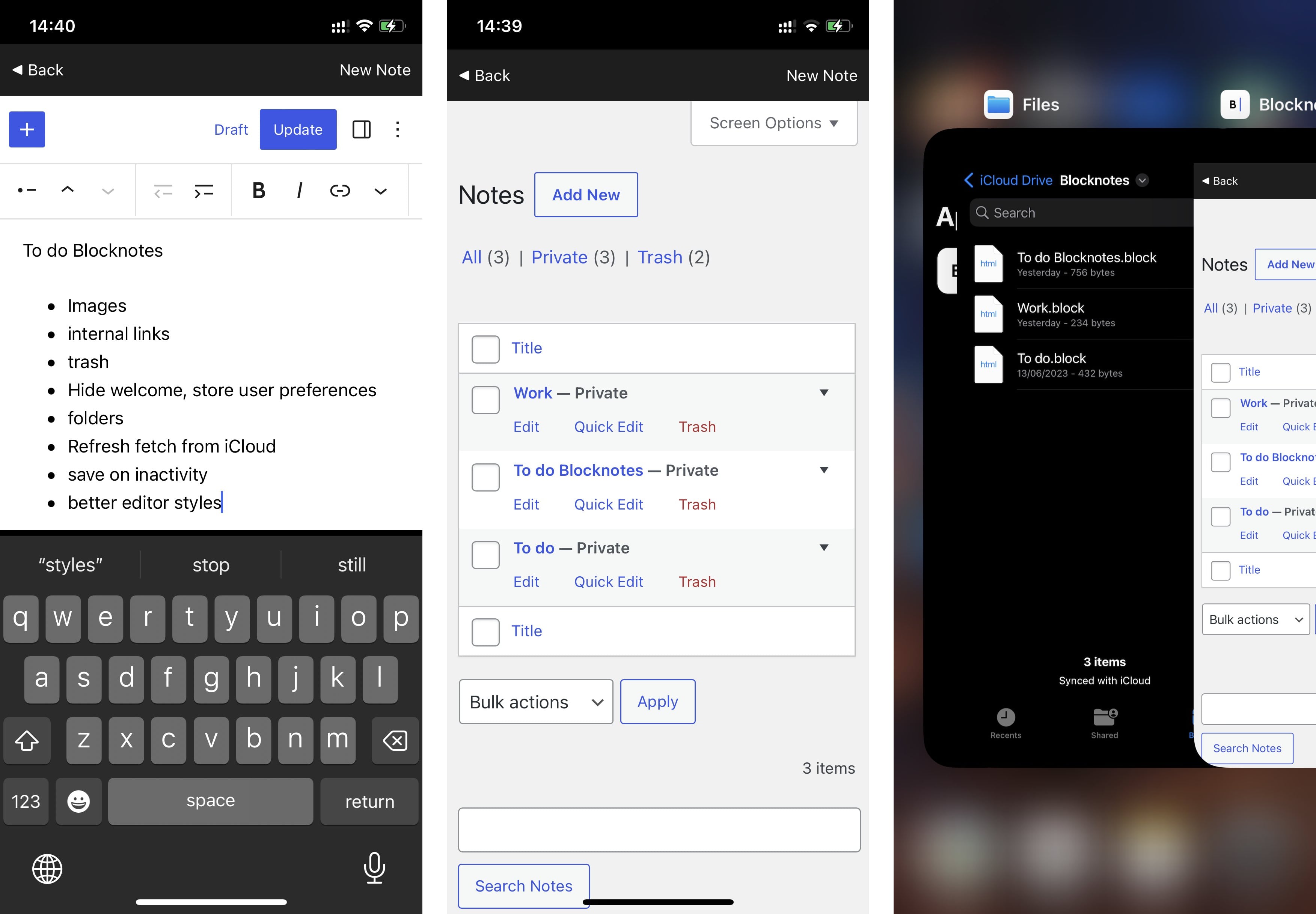 As you can see, your notes are then saved as HTML files in iCloud Drive and synchronized across Apple devices. Blocknotes is currently available on TestFlight and works well already. This project reminds me of TiddlyWiki, a wiki-style notebook in the form of a single HTML file.